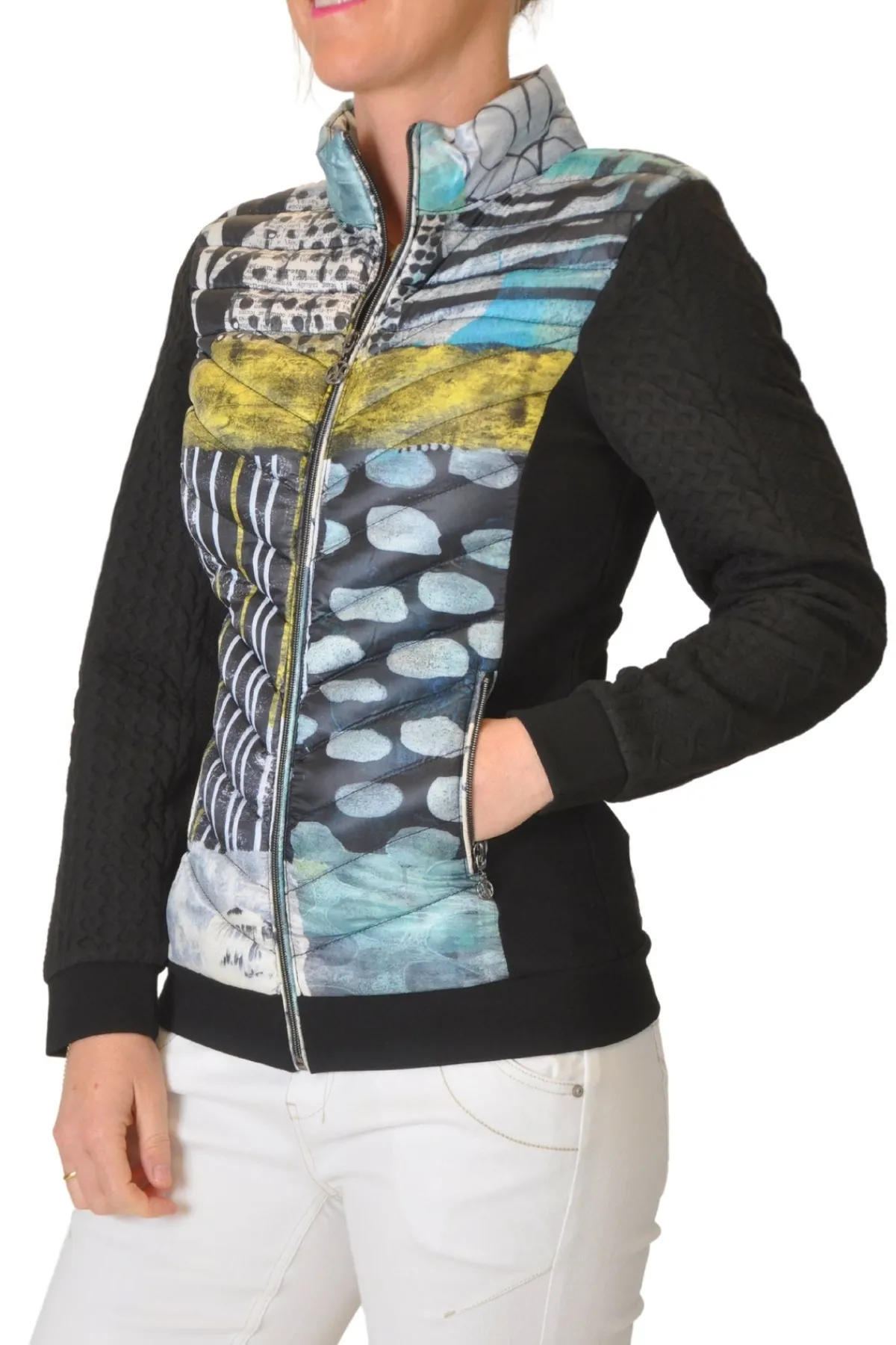 Featuring a high neck and pockets, this lightweight jacket will keep you warm without weighing you down. The knit braided contrast sleeves and black panel contrast hem add a touch of unique style. Stay cozy and stylish this season!