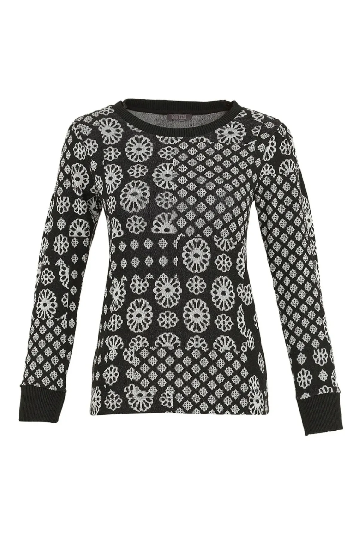 Indulge in luxury with our KNITTED PULLOVER TEE. This must-have piece features a gorgeous black and white floral geometric knit jacquard, perfect for adding a touch of sophistication to your winter travels. With its effortless pullover design, stay warm and stylish on your next adventure.