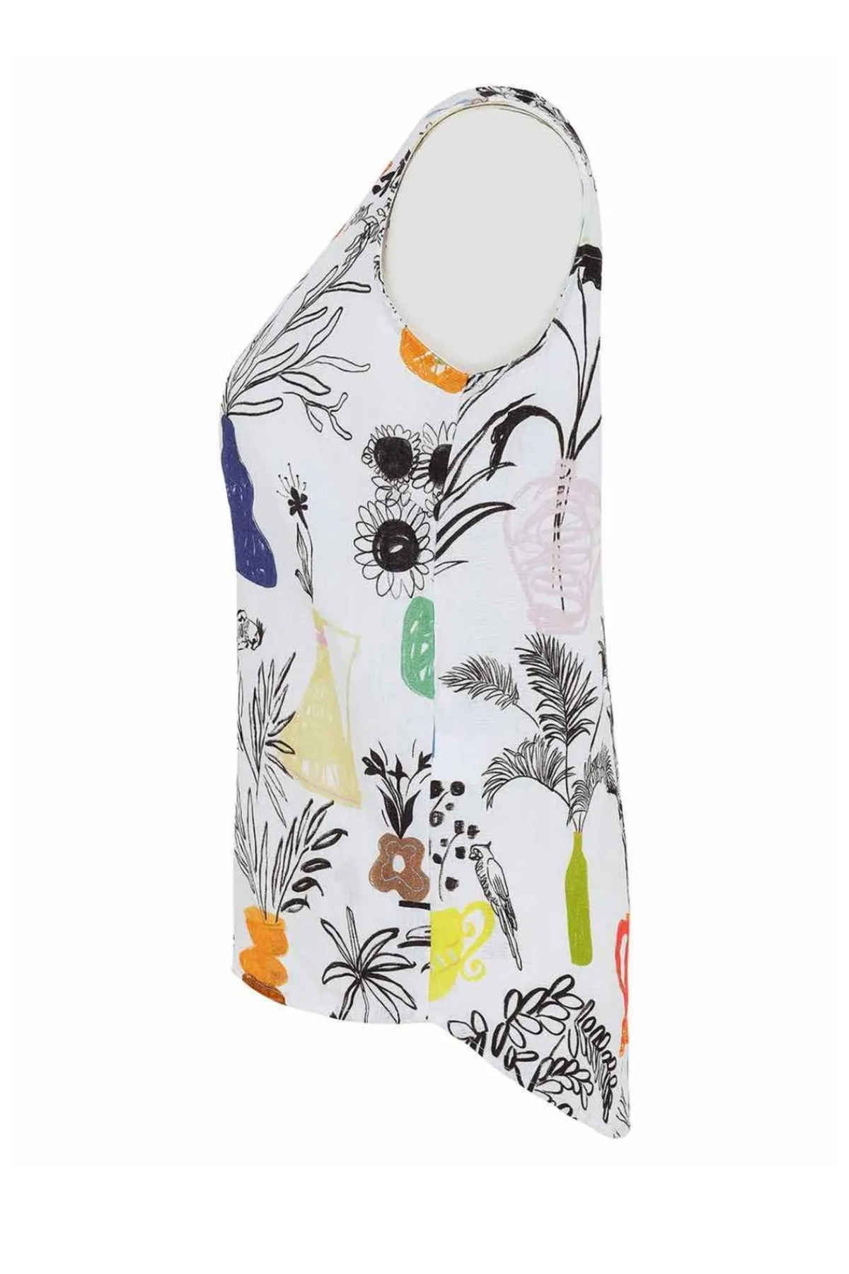 Embrace effortless summer style with our enchanting Botanical Print Sleeveless Top. This breezy top features a captivating print of hand-drawn plants and vases, adding a touch of whimsical charm to any outfit. The relaxed fit and curved hem offer comfortable elegance, perfect for warm days and breezy evenings. Pair it with jeans, shorts, or a skirt for a look that’s both playful and sophisticated.