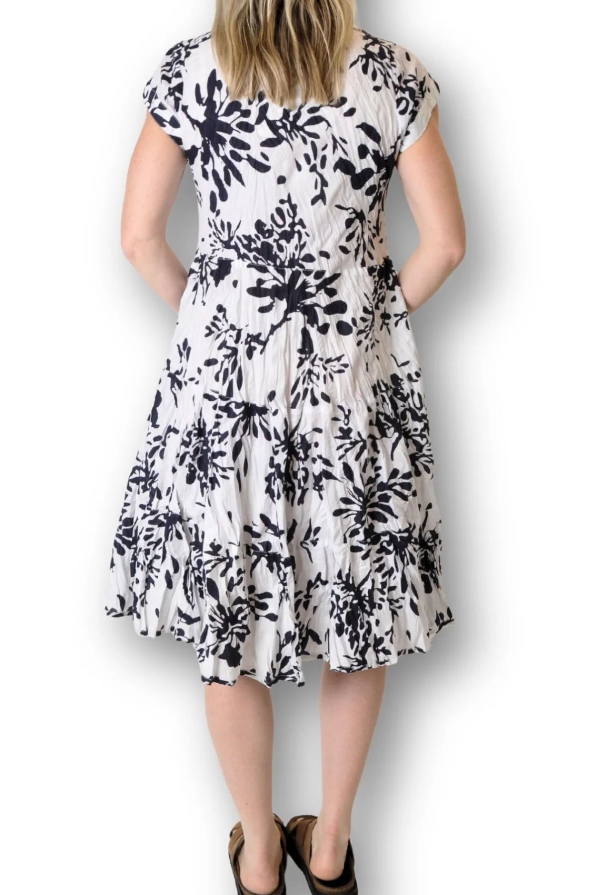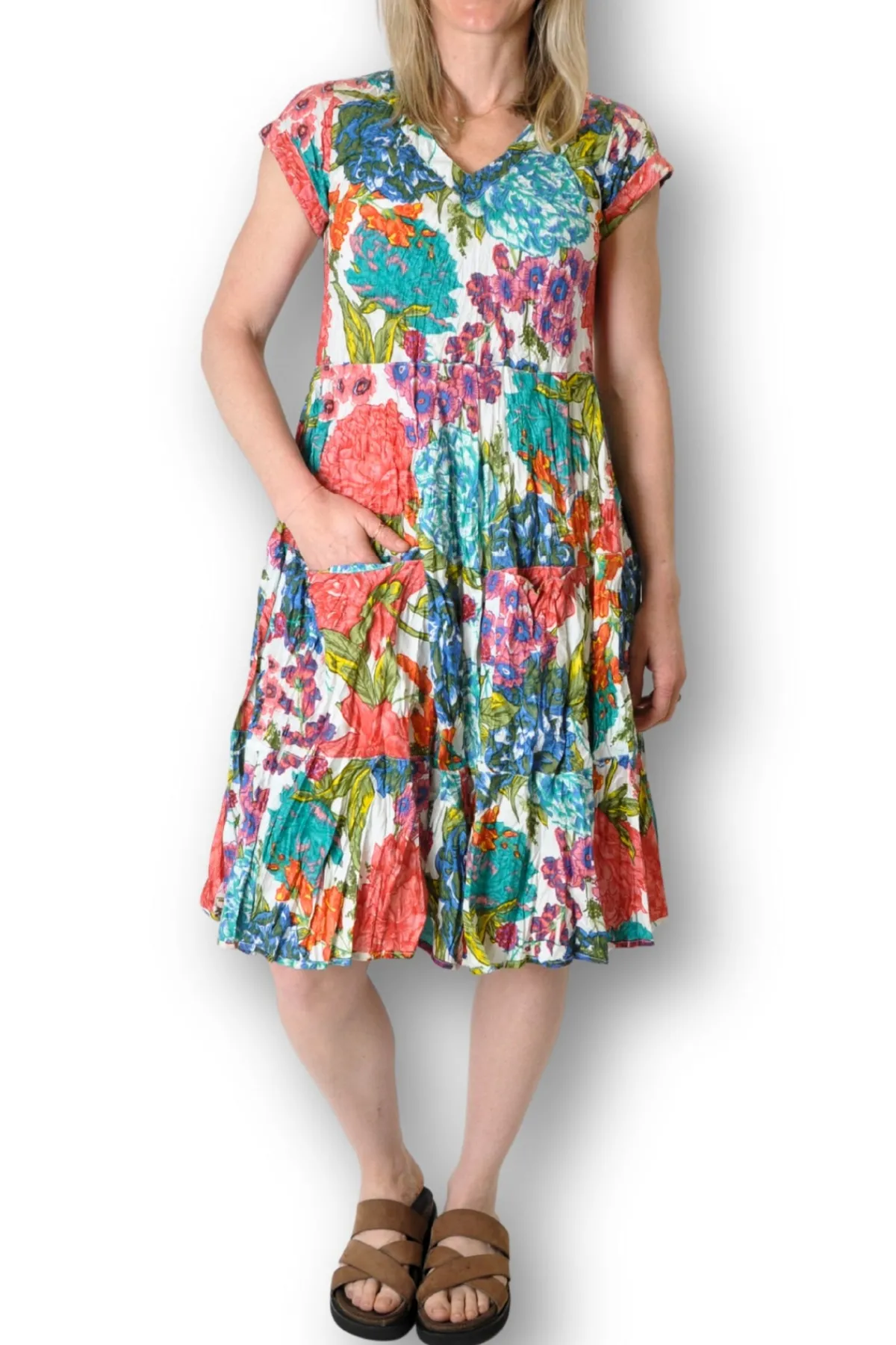 This playful cap sleeve dress in vibrant jade features a flattering v-neck and a breezy knee-length tiered skirt. Crafted from crinkle-effect fabric, it’s perfect for warm summer days and easy travel. Plus, with two handy front pockets, you can keep your essentials close while staying effortlessly stylish.
