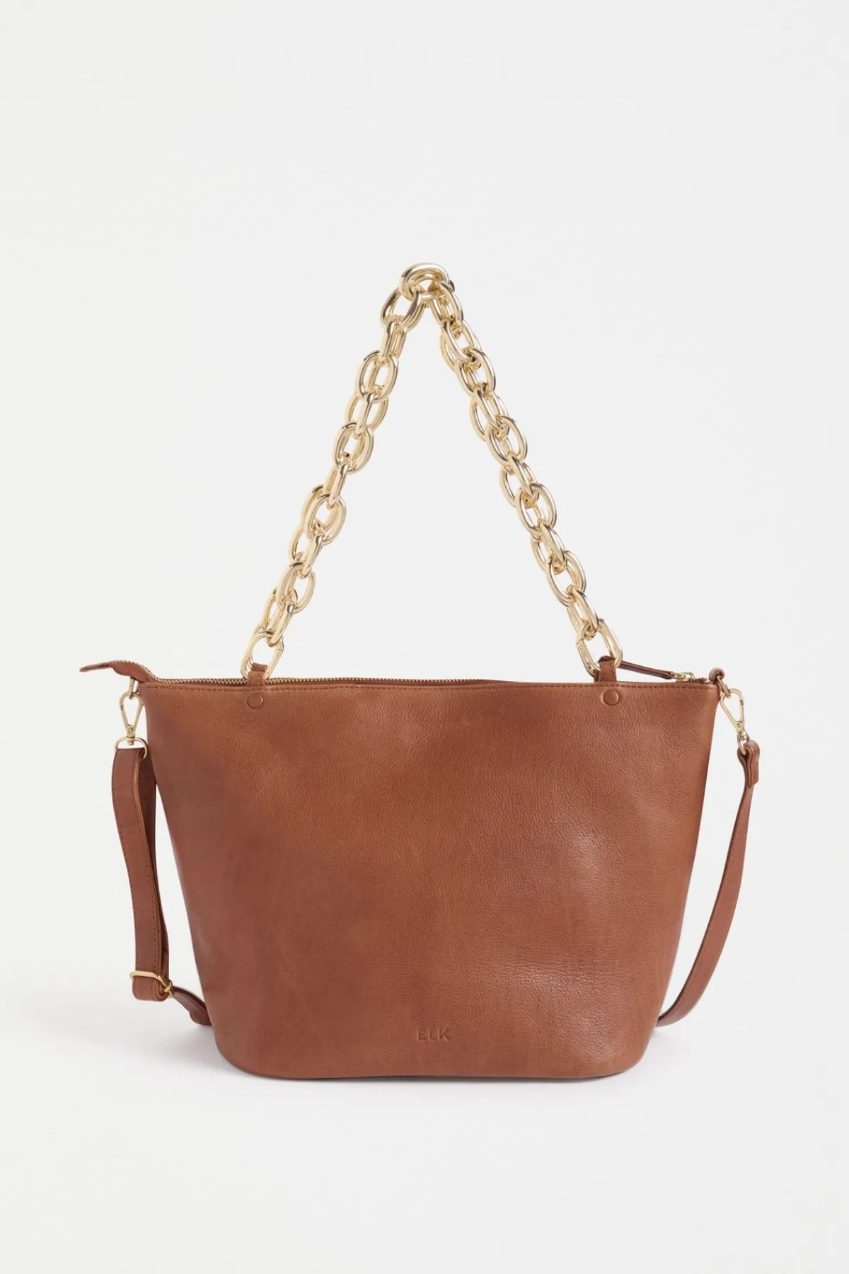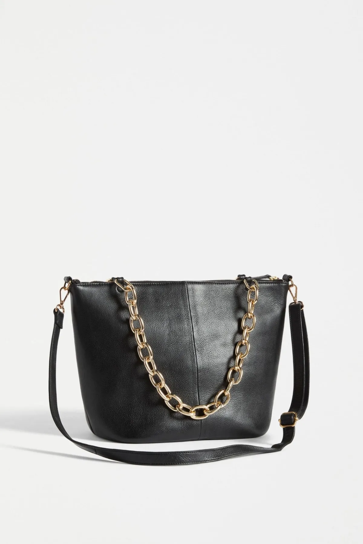 The Lenkka Bag is a classic large tote style with a thick chain strap made from shiny, gold oval links creating a statement, while the removable, adjustable, long leather strap allow for wear versatility. The spacious construction and chain detail make this bag perfect for both everyday functionality and elevated styling occasions.