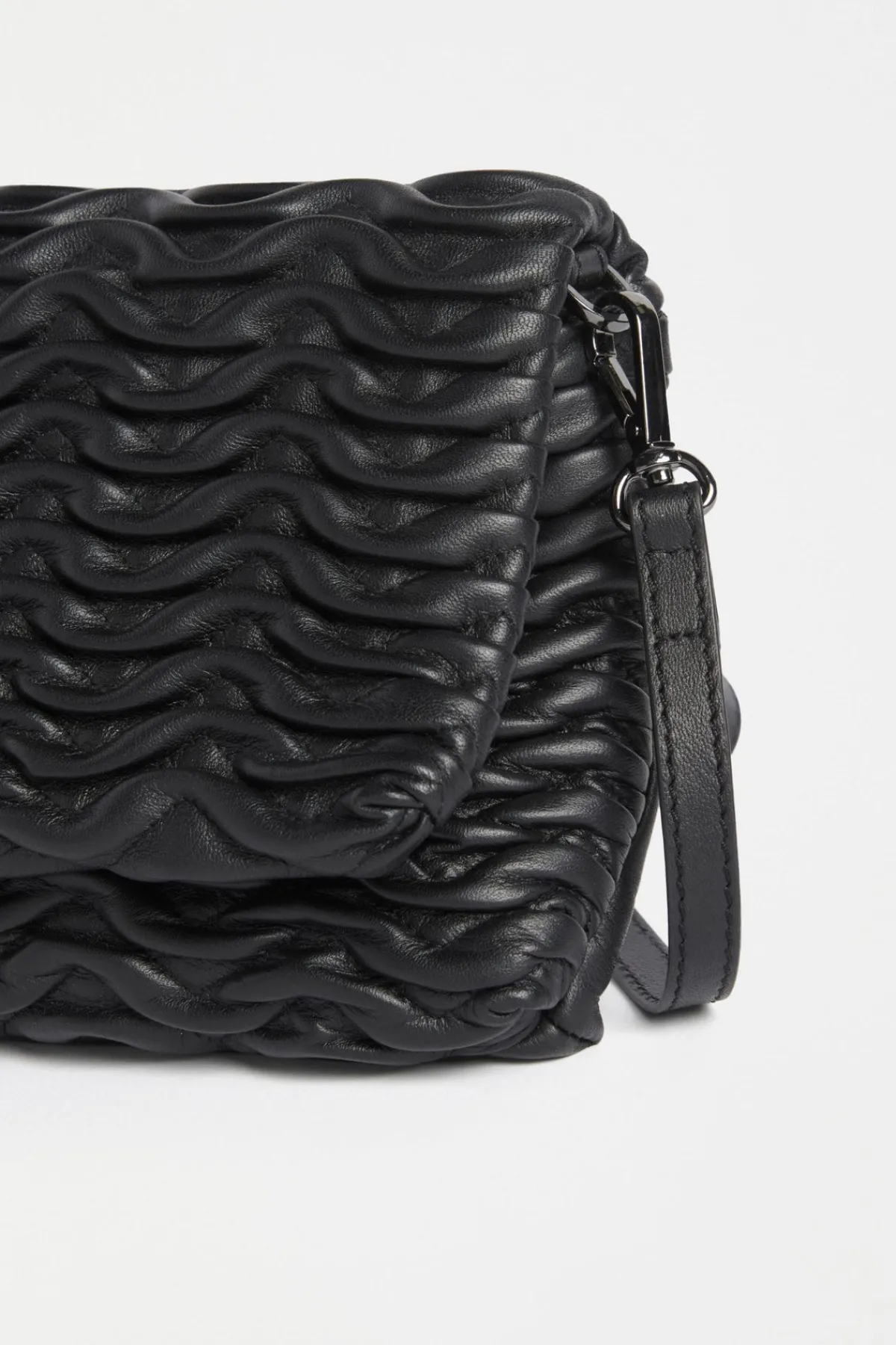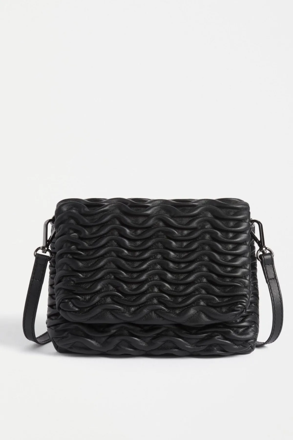 The Plissi Crossbody is a small clutch bag with a twist. Its textured smocking adds a playful edge, turning this simple bag into an eccentric statement. Inside, a back zip pocket keeps your essentials secure, while the snap closure ensures you can grab what you need. The detachable, adjustable crossbody strap offers effortless versatility. For a little pop of texture, the Plissi Crossbody is your go-to. Crafted from soft sheep leather, it comes in three standout colourways. Choose from classic Black, or select Gunmetal, and Bronze – each with a metallic foiled finish. This leather is sourced from a Leather Working Group Gold-Rated tannery – a third-party certification that recognises efforts to reduce environmental impacts in leather production.