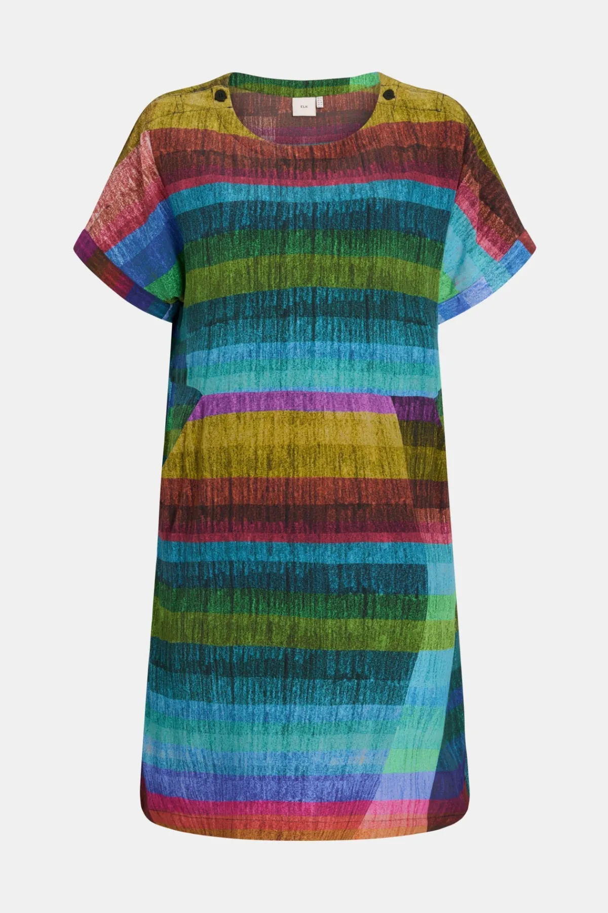The Sono Dress is a classic, short shift style tee dress in the vibrant multi coloured Komi Print. This easy-to-wear, slip-on, regular fit, day dress features two angled front pockets and round neck with functional button detail on the sides. Crafted from a super soft, lightweight ECOVERO™, an ELK environmentally preferred fibre. Finished with short batwing sleeves, this playful dress will be an easy, to-go addition to your weekend and warm weather wardrobe. Pair with our Jyrti Platform sandal or our Ostt Sandal