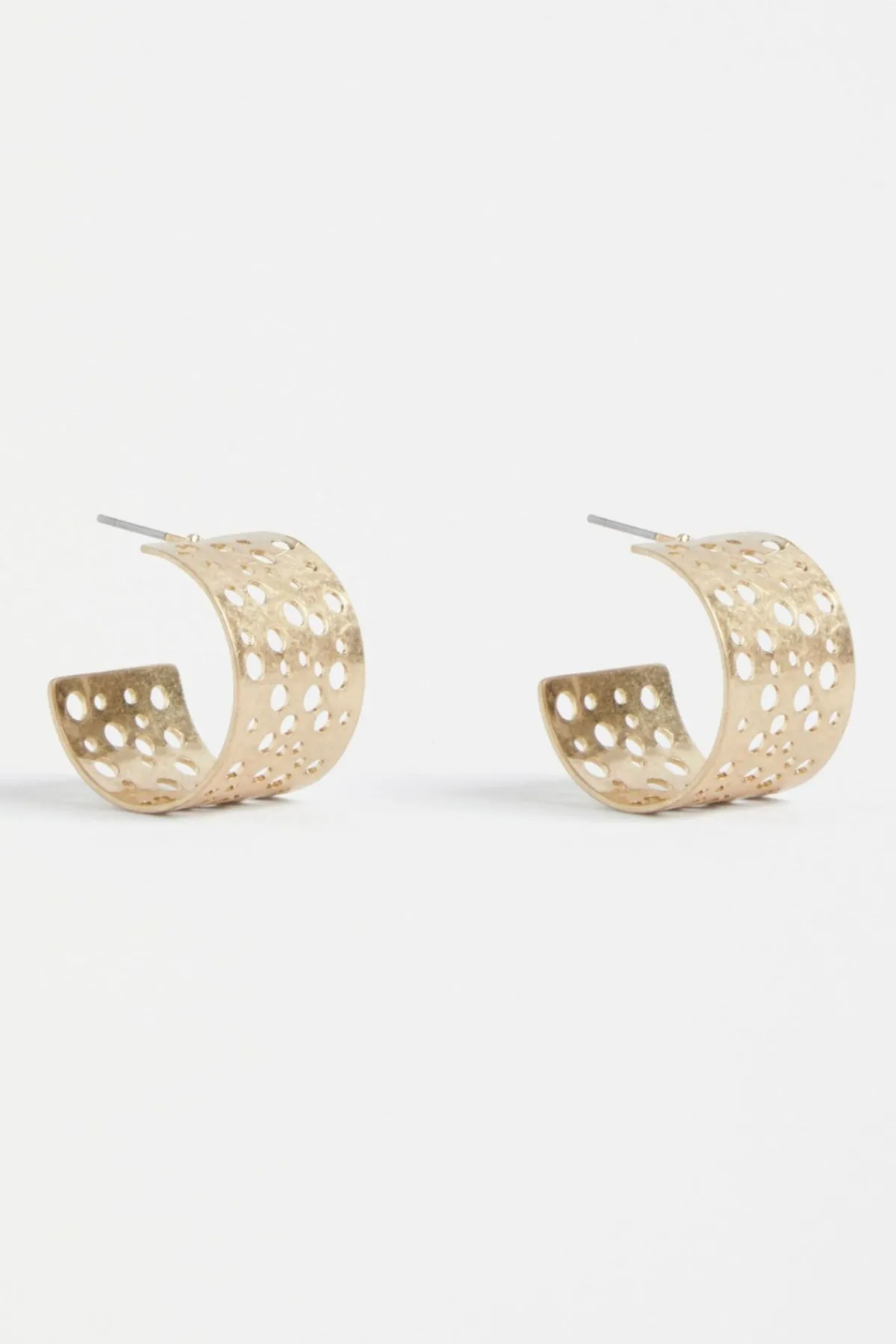The Hulle Tiny Hoop Earring. Crafted from metal with a unique punched design, the varying hole sizes bring texture and interest to the classic gold finish. With their worn-in feel, they’re a piece you can effortlessly add to any outfit, and trust that they will stand out on their own.