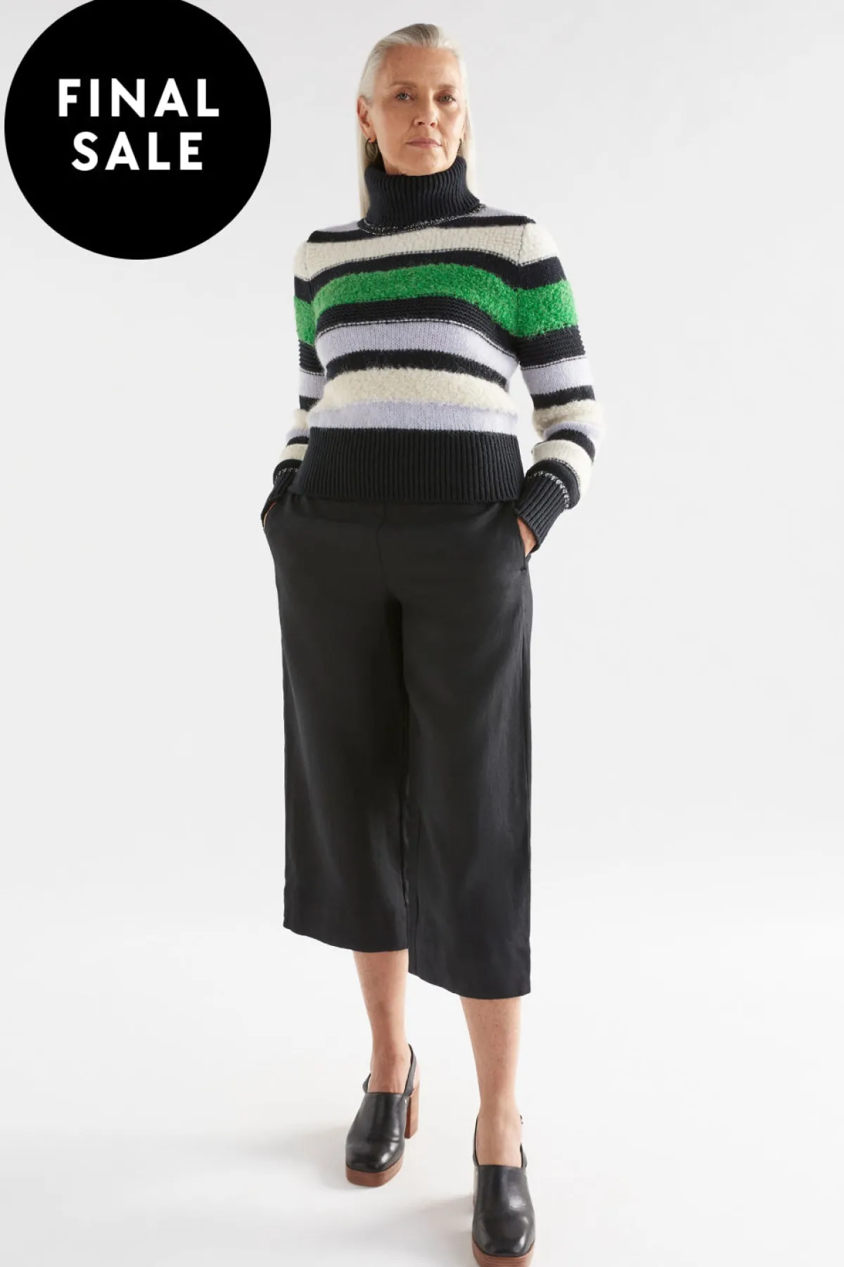 The Olli Sweater is a slightly cropped sweater featuring a ribbed roll neck and a long, set-in sleeve with a wide ribbed cuff. The feature of this design is the multicoloured and multi-stitch design, which creates varying textures on the sweater. Crafted from a blend of yarns, this sweater has a unique combination of smooth and fluffy finishes.