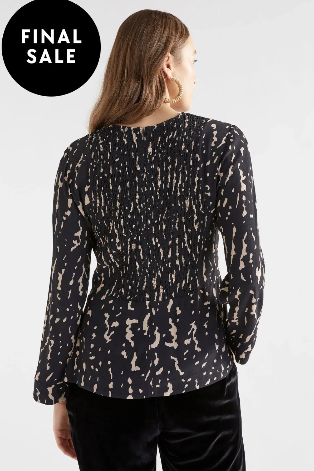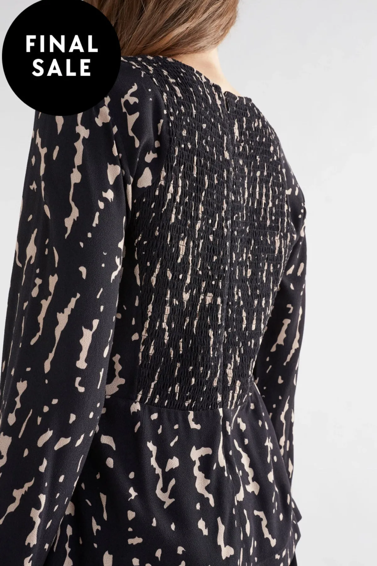 The Solina Top is a crew-neck top with a back shirring panel for interest. The top features a waistband at the front and side splits at the hem. The long, slightly wider sleeve has a fixed, wide cuff, and there is a zip at the centre back for access. While the shirring gives some flexibility through the upper back, the waistband is fixed. Crafted from a textured blend of ECOVERO™ Viscose and Naia Acetate, this shirt has a soft drape and a crepe-like feel.