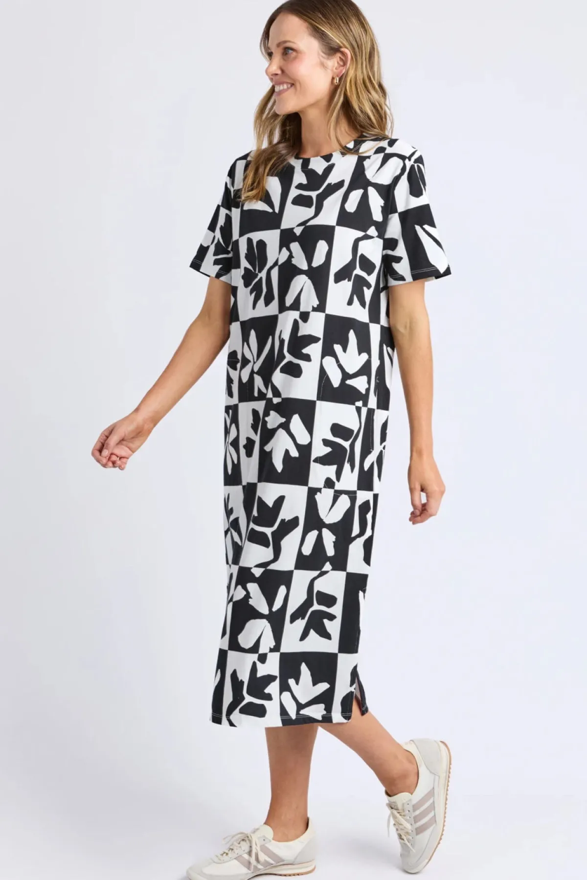 Effortless style meets everyday comfort in the Splice Dress. This relaxed tee shirt dress features a simple, flattering silhouette that works for any occasion—from casual outings to weekend errands. Short sleeves keep you cool, while practical side pockets add functionality without compromising the clean aesthetic. The striking black and white print makes a subtle statement. Simply throw it on and go—no fuss required. Perfect for those mornings when you want to look put-together without the effort