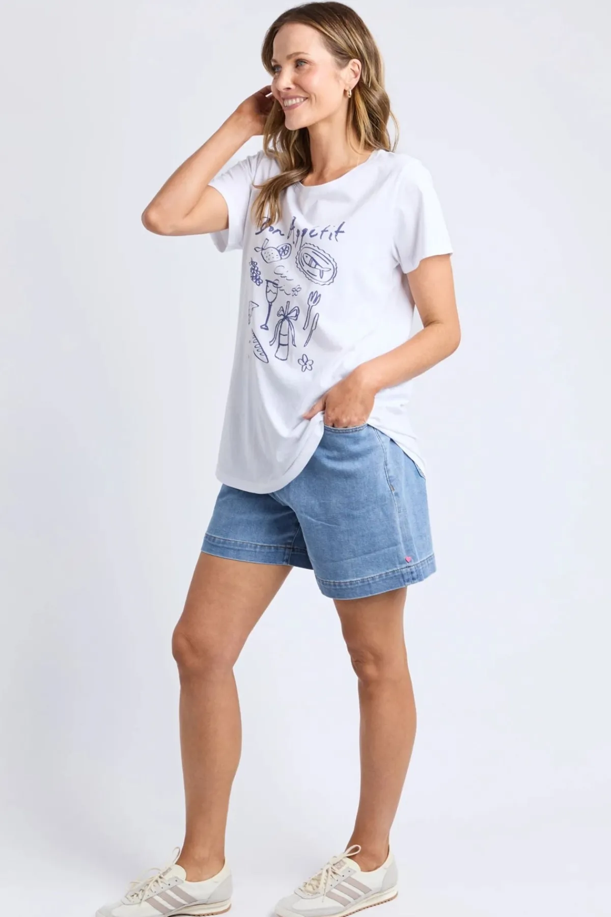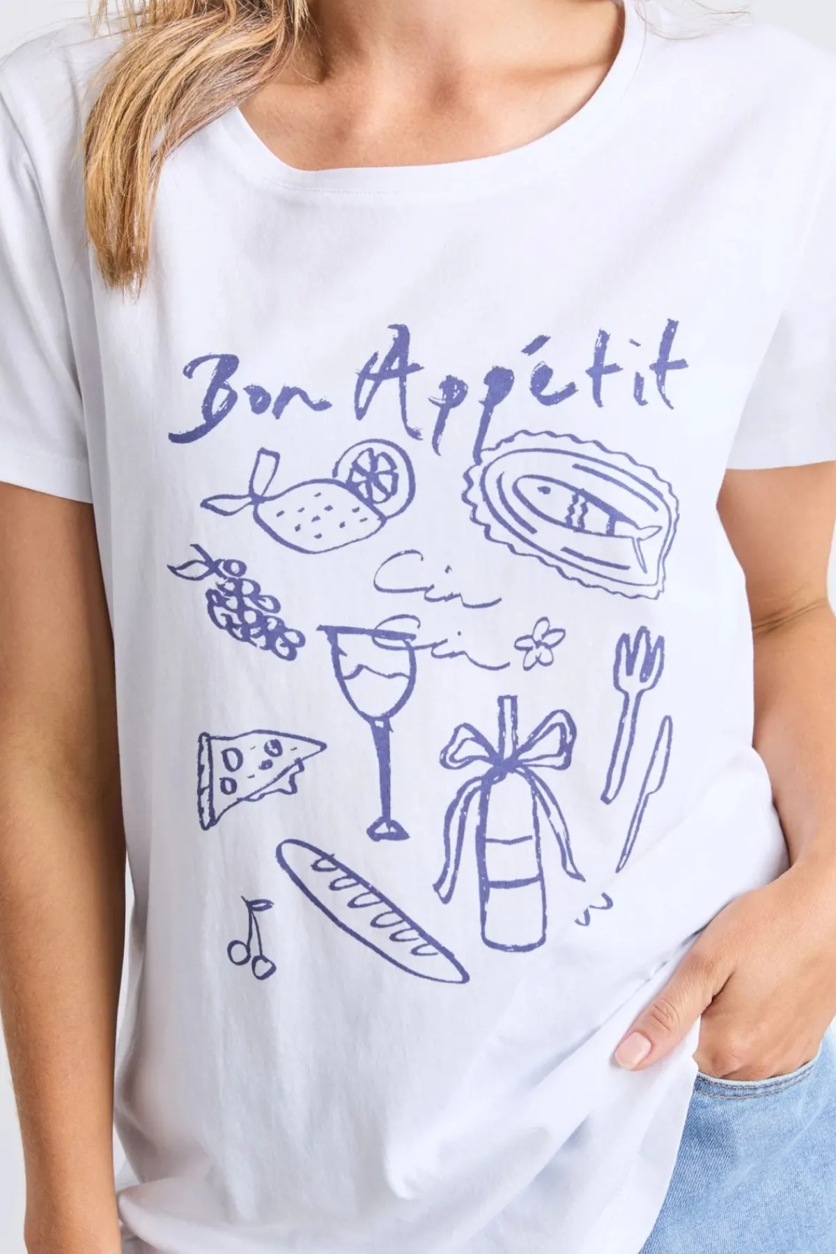 Bring a dash of culinary charm to your summer adventures with this delightful tee, complete with a cheeky “Bon Appetit” print in vibrant blue on a clean white base. Perfect for jet-setting foodies who live for their next gastronomic discovery, this playful piece keeps things light and fun whether you’re exploring bustling food markets or settling in at a cosy bistro.