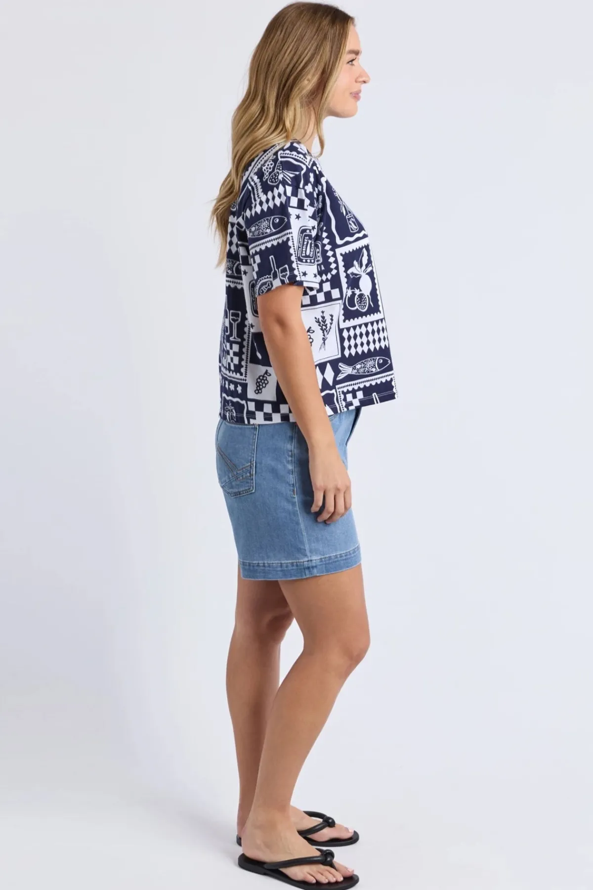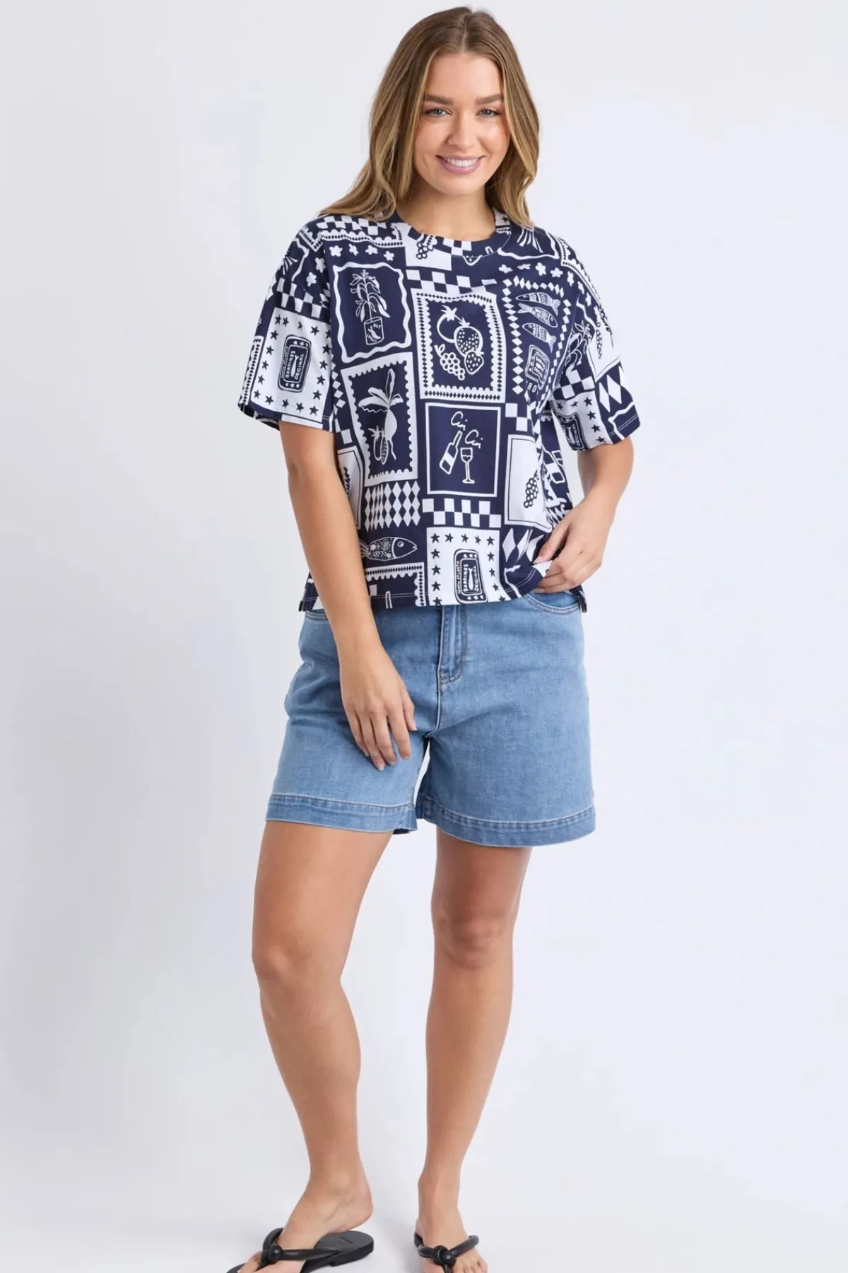 This Chin Chin Tee Shirt features an exclusive yardage print that adds a unique touch to your casual wardrobe. Elevate your look with this distinctive tee that effortlessly blends bold patterns and fun spirit!