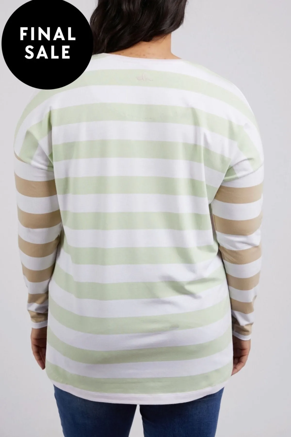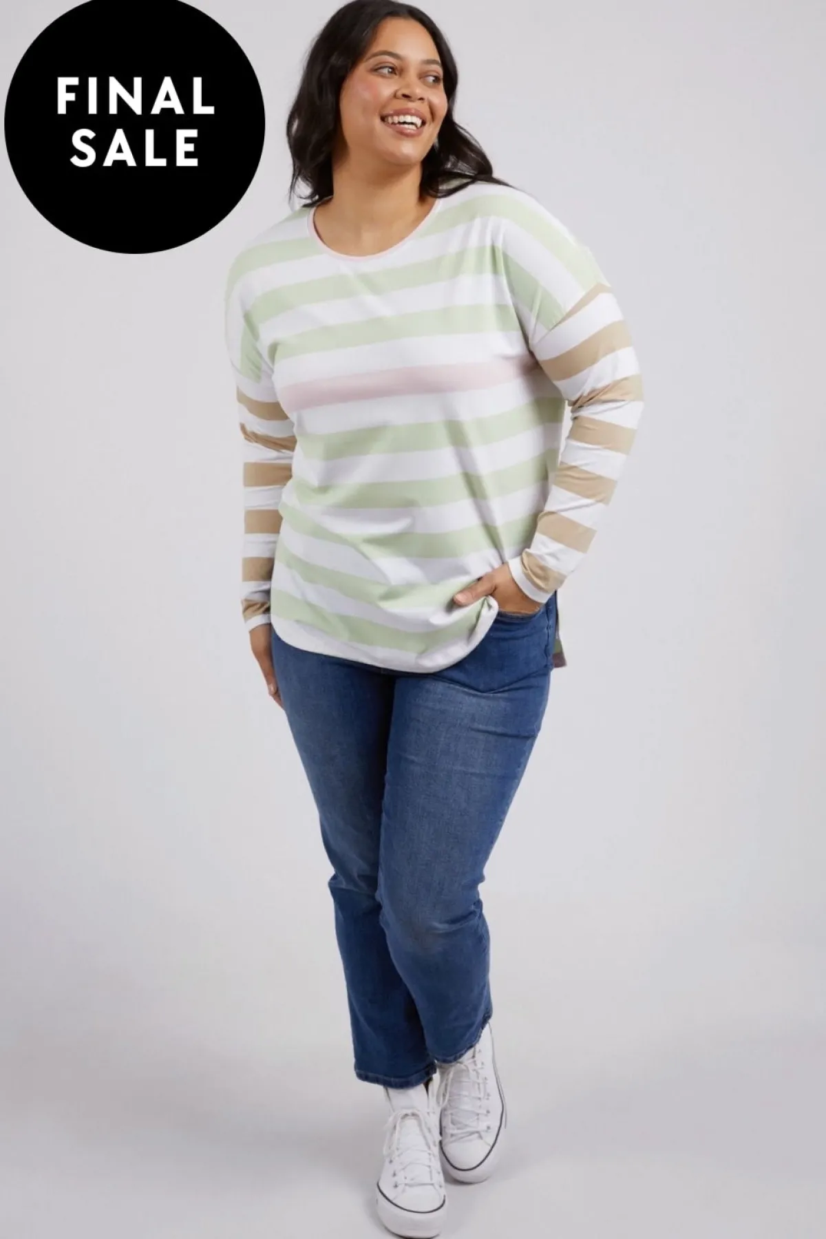Fantastic long sleeve tee for everyday wear. Featuring gorgeous soft hued stripes and a scooped hemline making it ideal for layering under your favourite crew or wearing by itself atop your favourite denim.