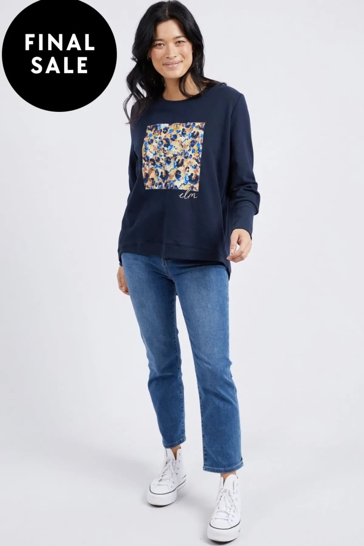 Featuring an exclusive Elm print on the front this classic navy crew will fit seamlessly into your wardrobe this season. The extra wide cuffs and scooped hem provide the ultimate in flattering style and make this crew perfect for everyday wear.
