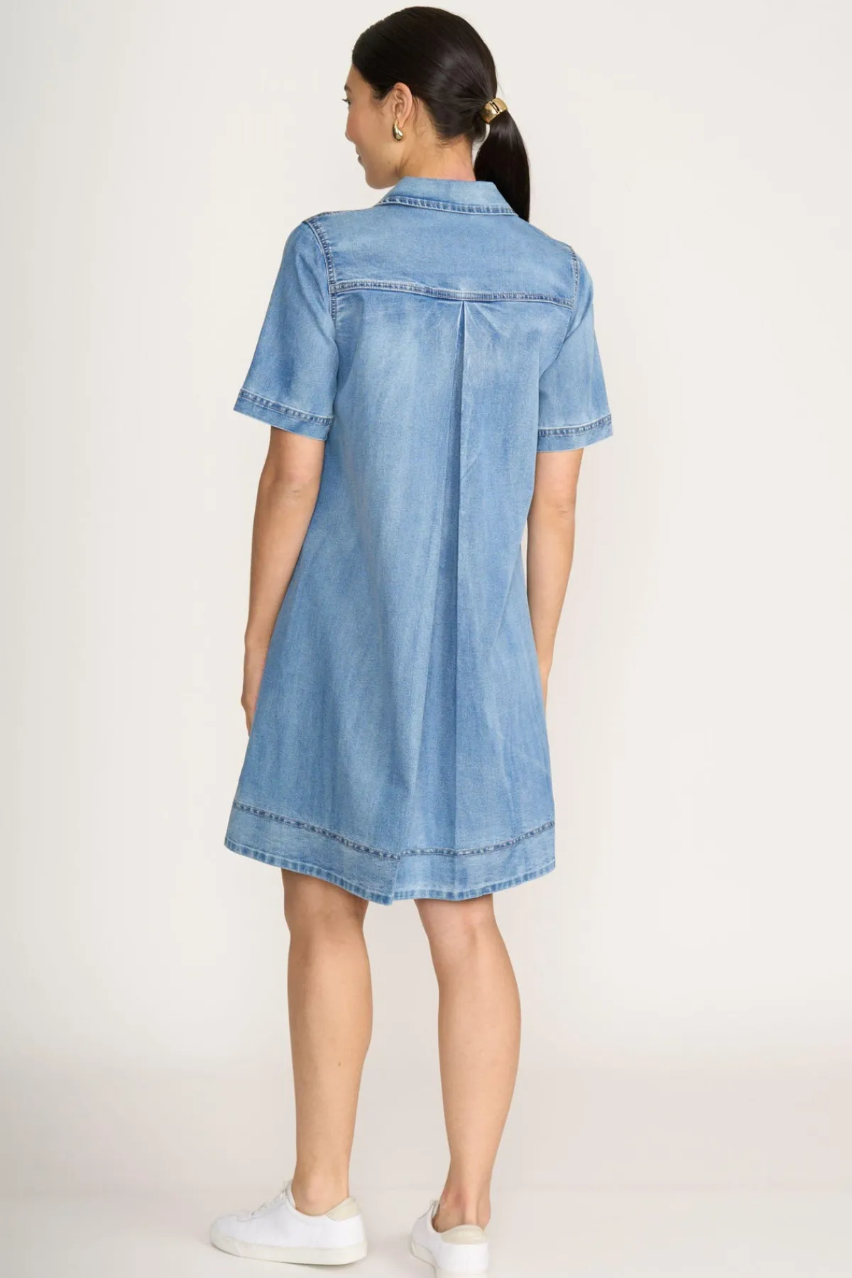 This Jean-ious Dress in a soft blue wash features a relaxed fit with a flattering V-neckline, ensuring comfort and effortless style. Designed with functional front pockets, it combines practicality with a casual, polished lookâperfect for day-to-day wear or weekend outings. Its breathable fabric and thoughtful silhouette make it an expert choice for versatile, easy dressing.