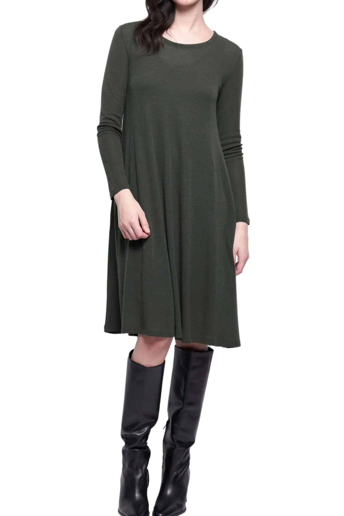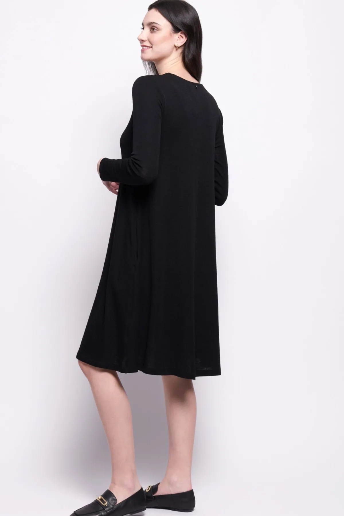 Crafted from a lightweight, flowy fabric, this dress drapes beautifully, offering a flattering and comfortable fit. Whether paired with sleek boots and delicate accessories, this piece is a timeless addition to your collection.