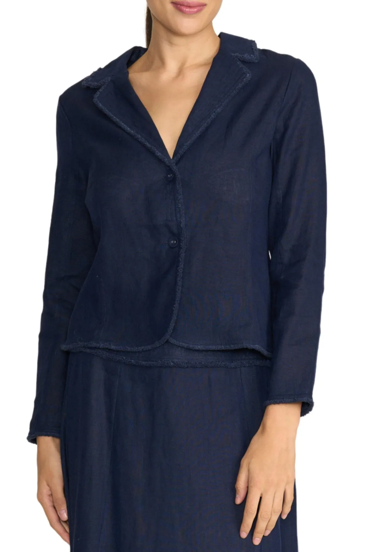 A softly tailored layer that instantly pulls outfits together. This lightweight jacket features a neat collar with revere and a gently curved hem that skims the hip. Subtle seam work through the back adds shape without feeling tight—perfect over dresses, tees and wide-leg pants when you want polish without the bulk. Fringe detailing on hem, collar and cuff. Wear with the matching Navy skirt.