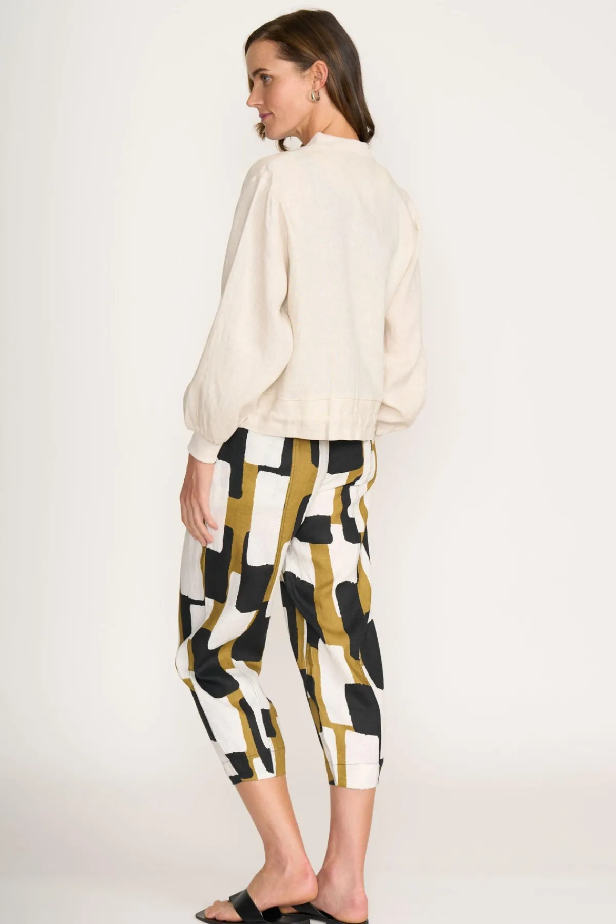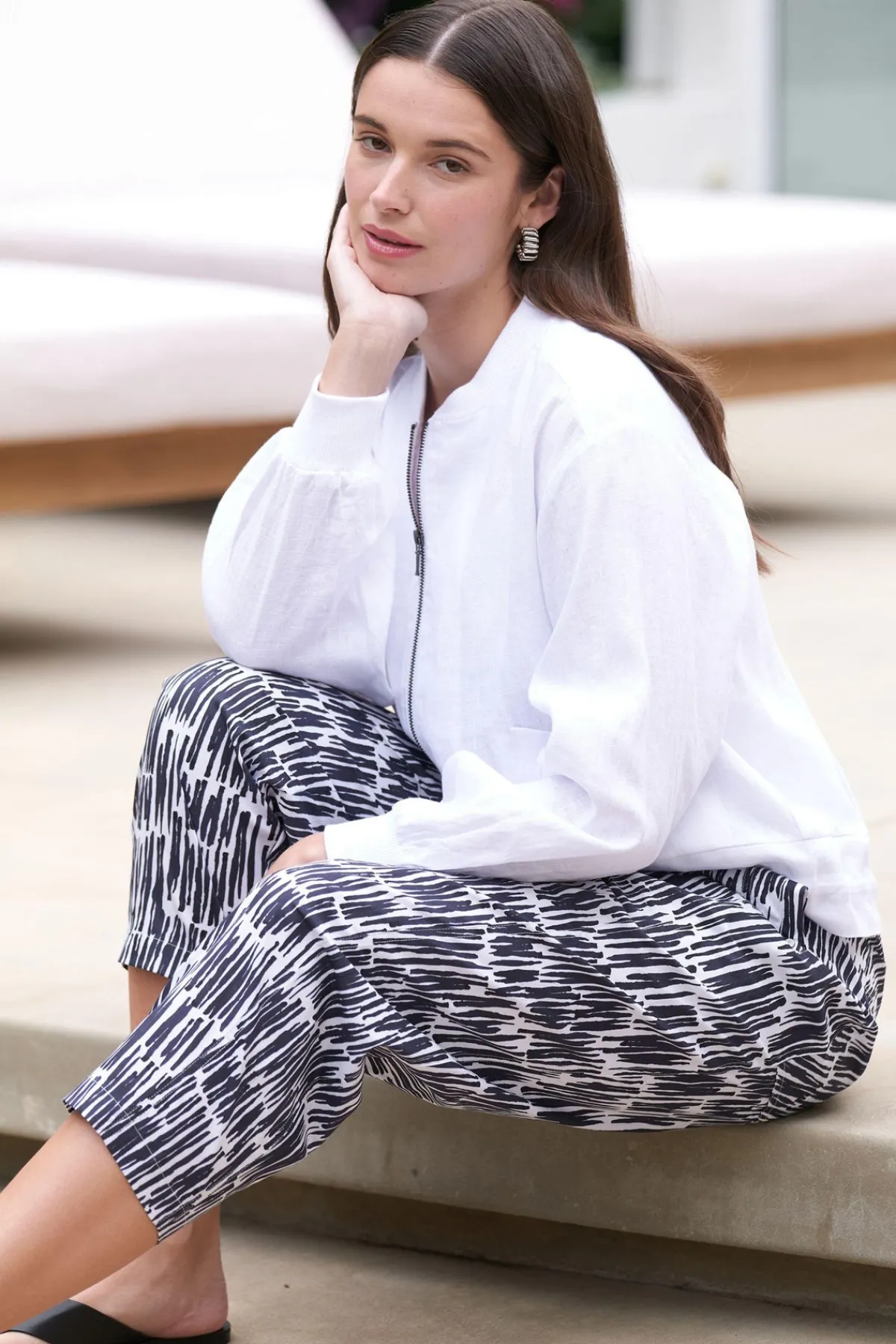 Experience effortless style with the Natural Ability Jacket, a sophisticated take on the classic bomber. Crafted from breathable linen, it features ribbed neckline and cuffs for subtle texture, functional front pockets, and a drawstring waist to tailor the fit. Its cropped length adds a modern edge, making it the perfect weekend companion for refined comfort and versatile layering.