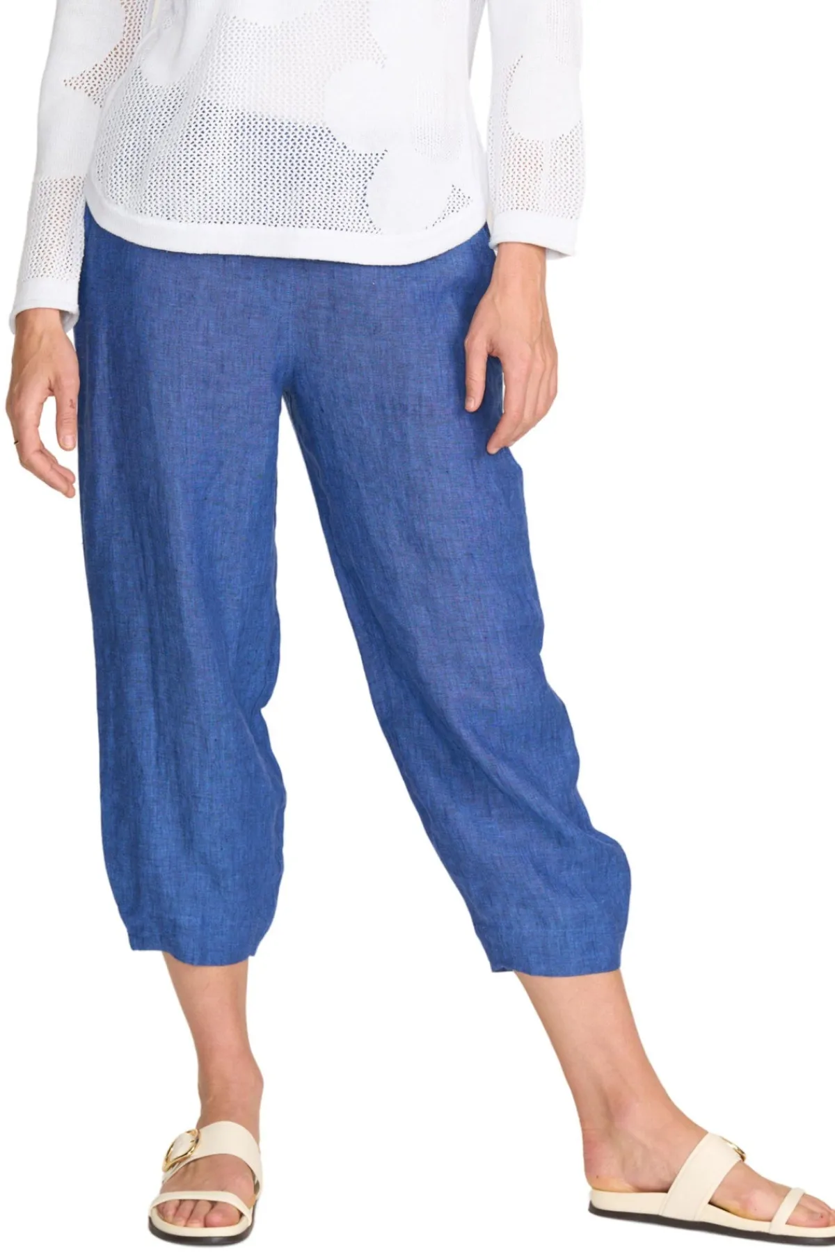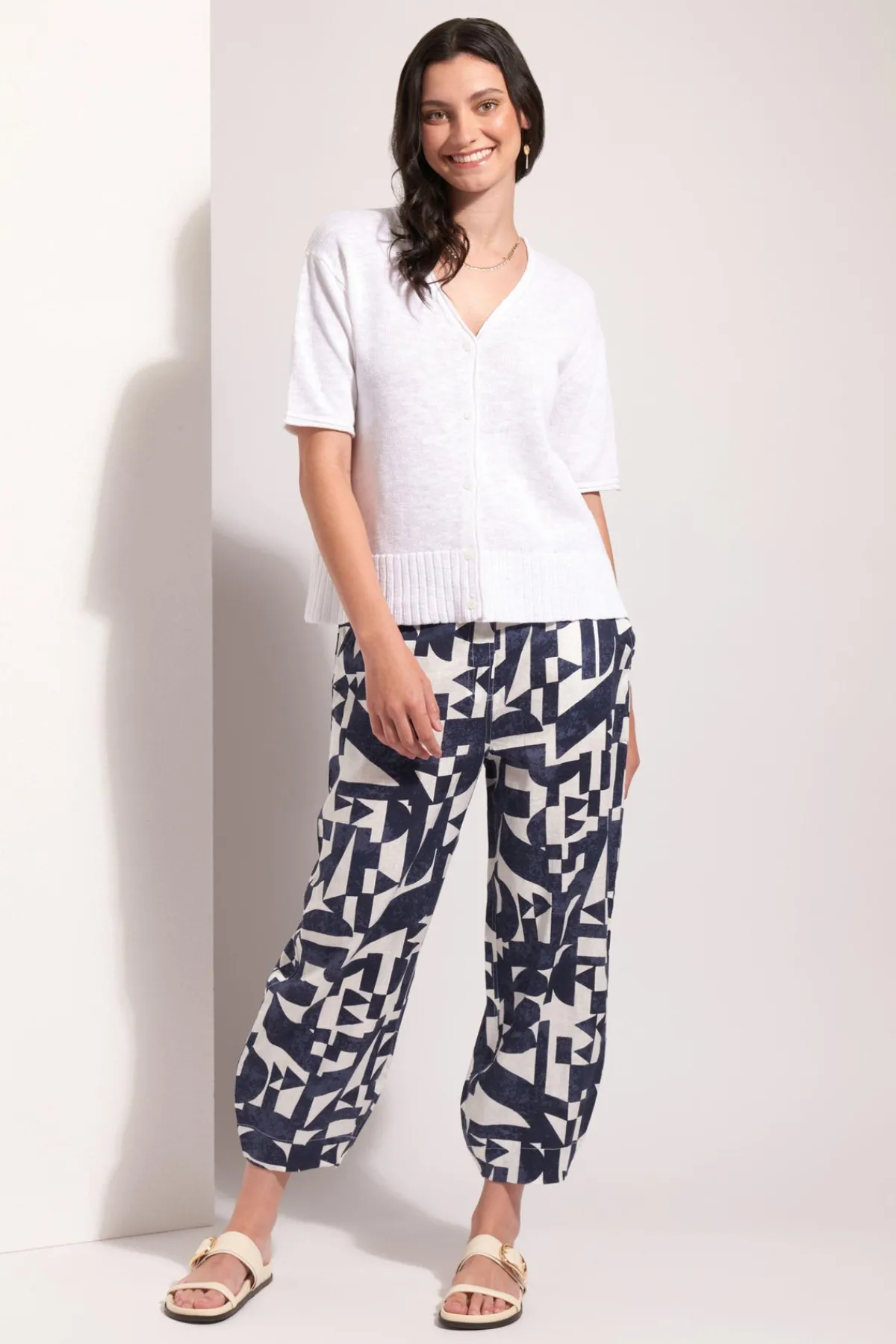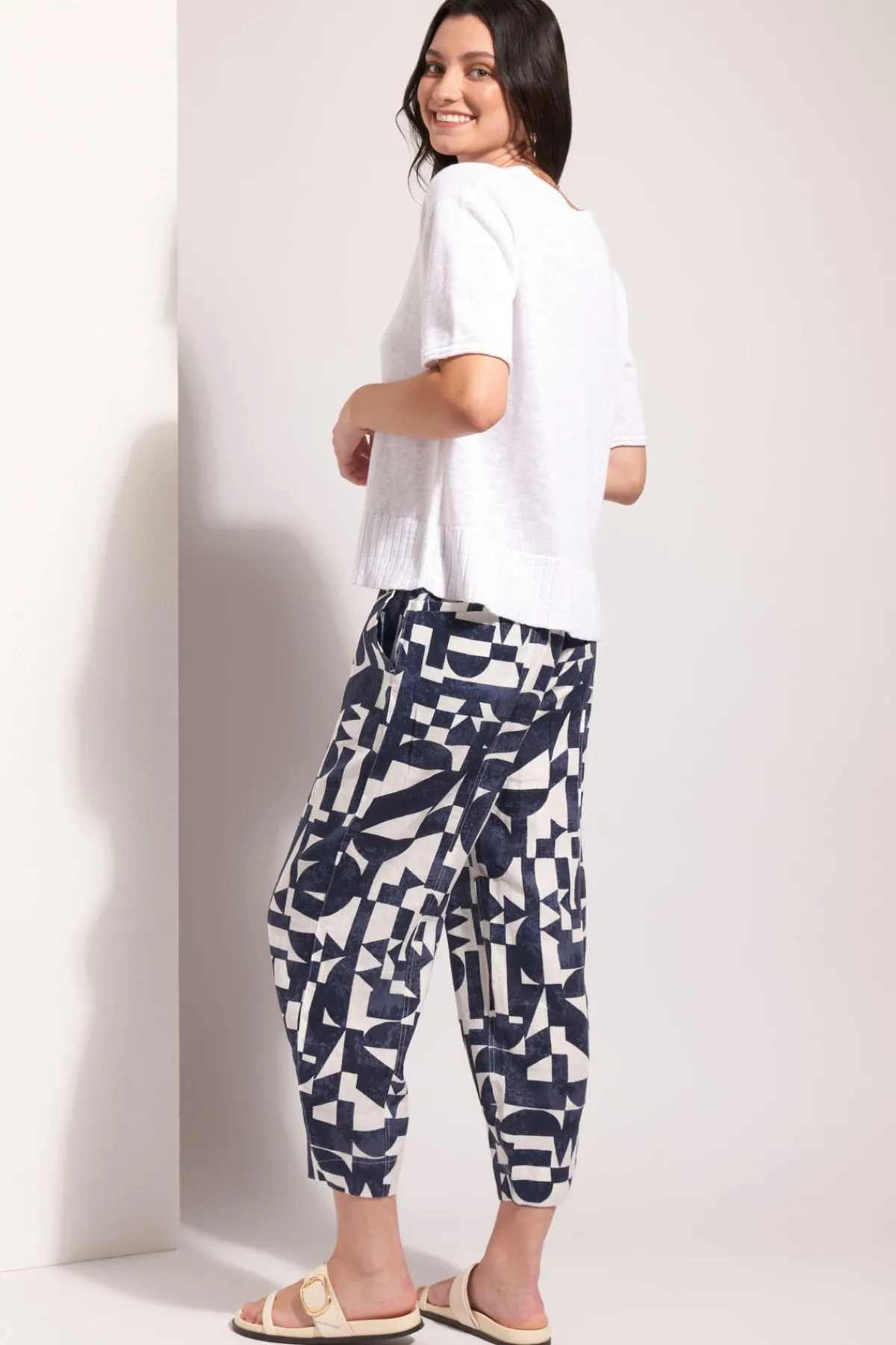 Experience effortless sophistication with the Jubilant Pant. Designed with a flat front waist and an elasticated back waistband, these linen pants combine comfort and style in a pull-on silhouette. Featuring side and back pockets and a flattering barrel leg shape, they are perfect for travel or relaxed weekends, offering versatility without compromising on elegance. Wear the Navy/White pant with its matching top.