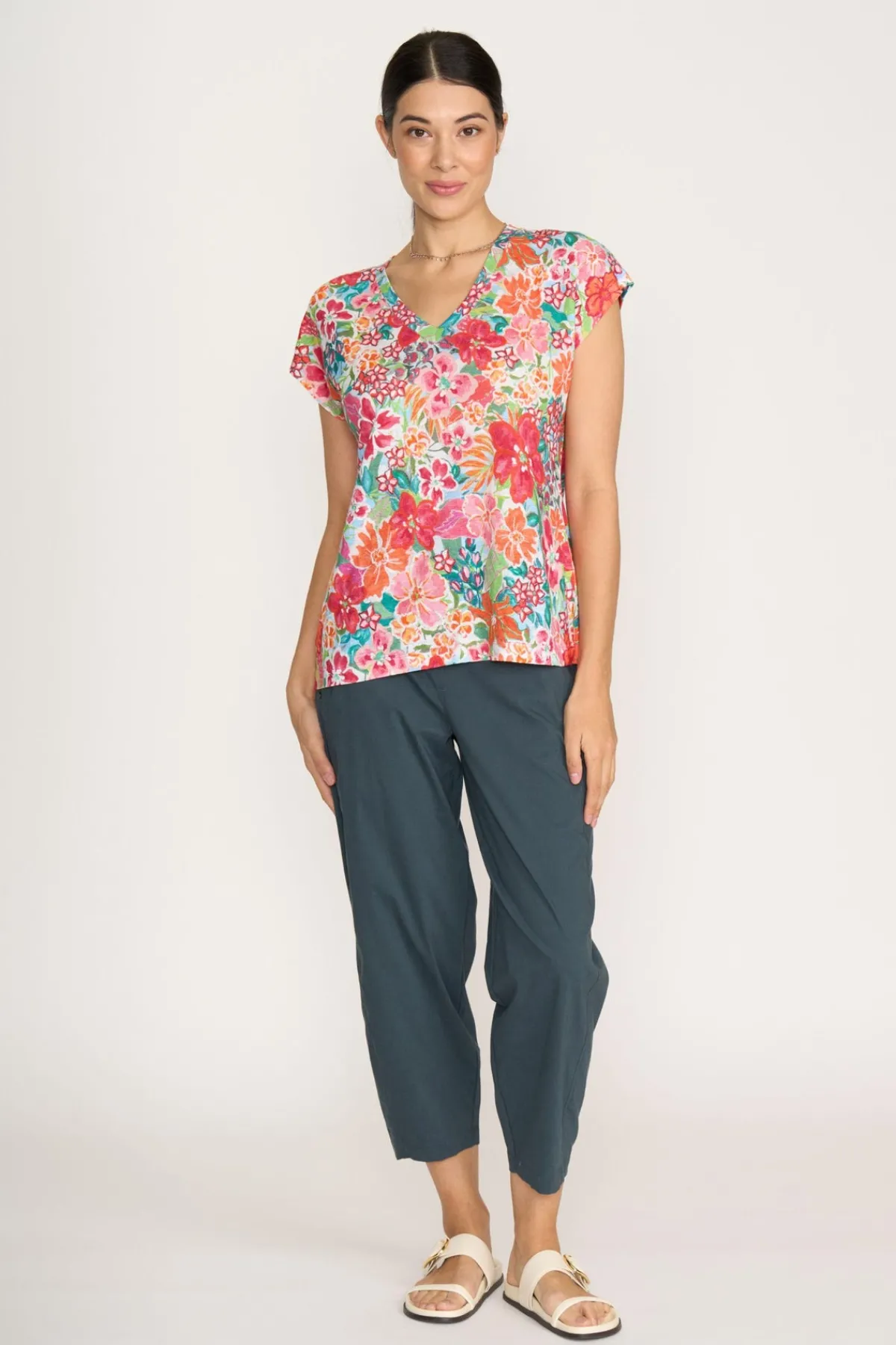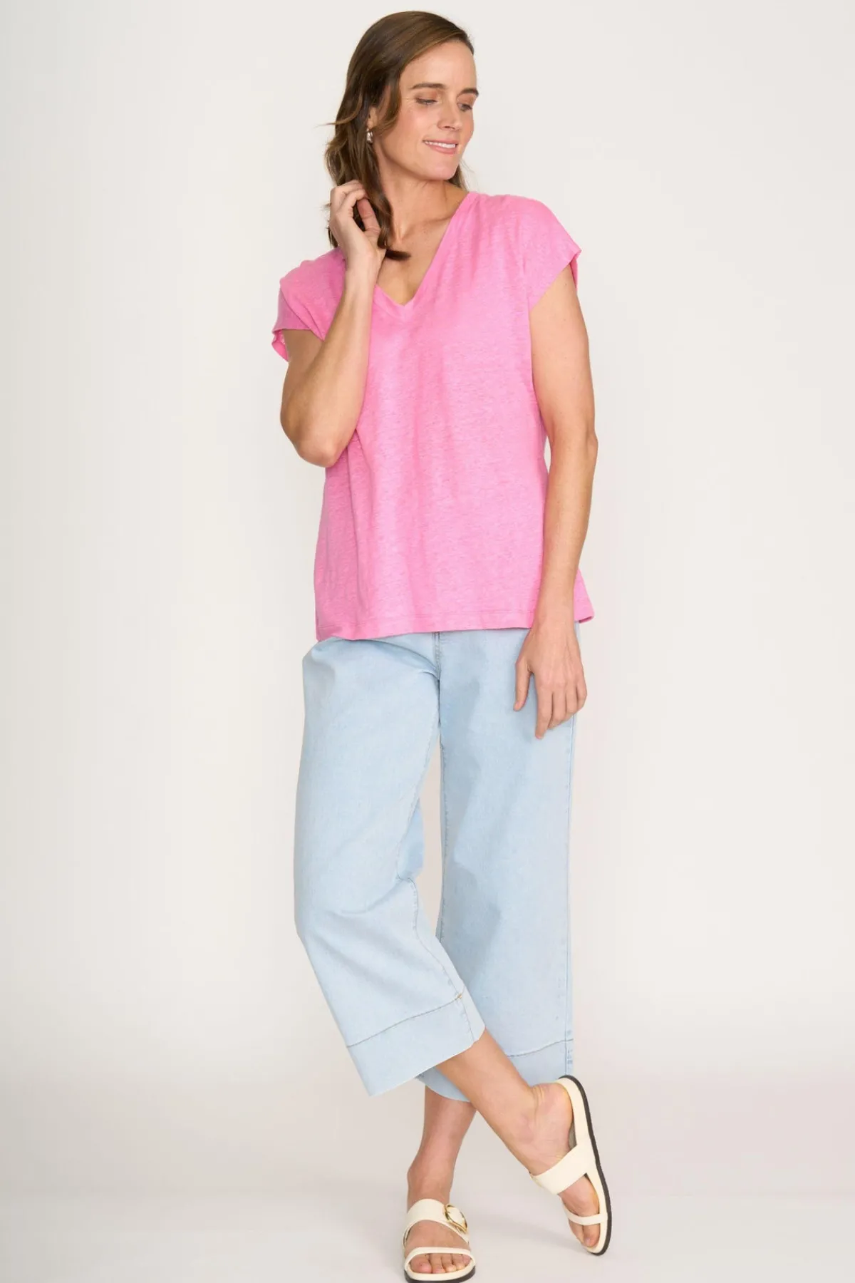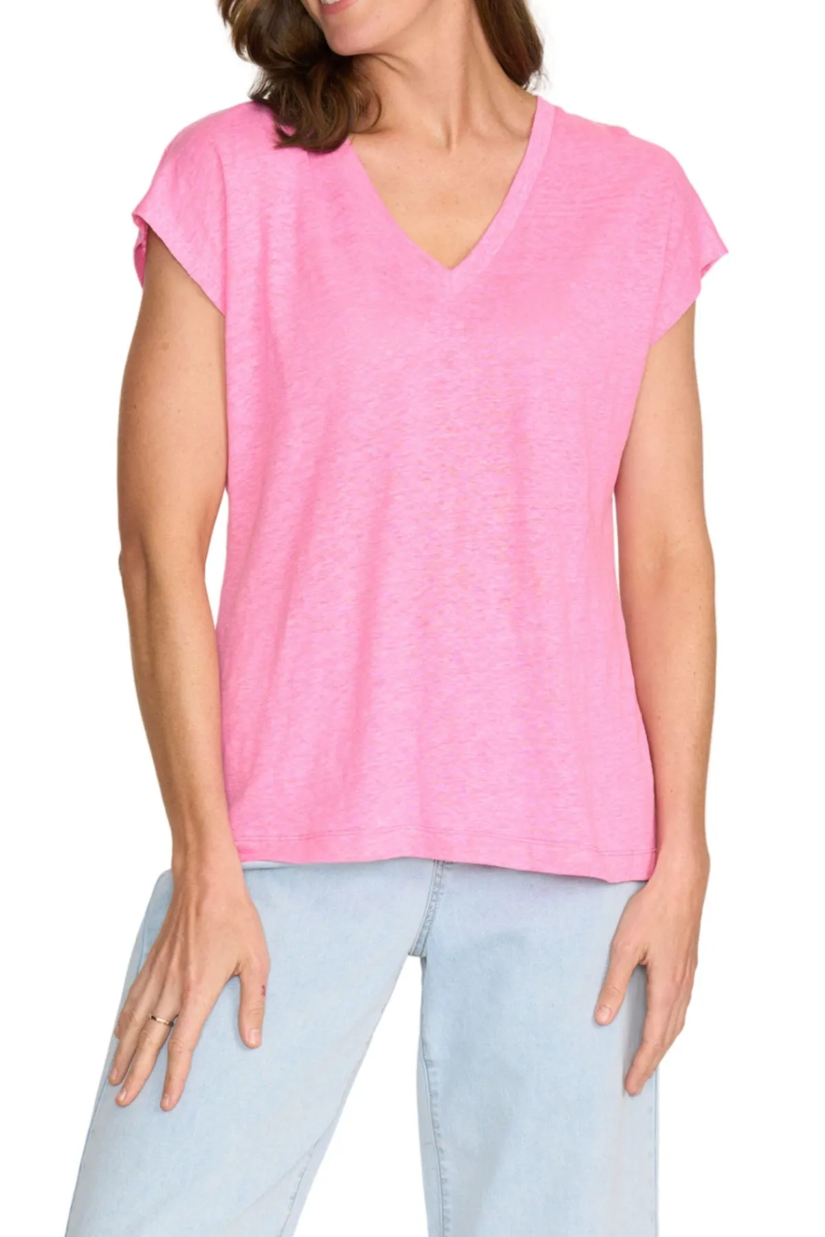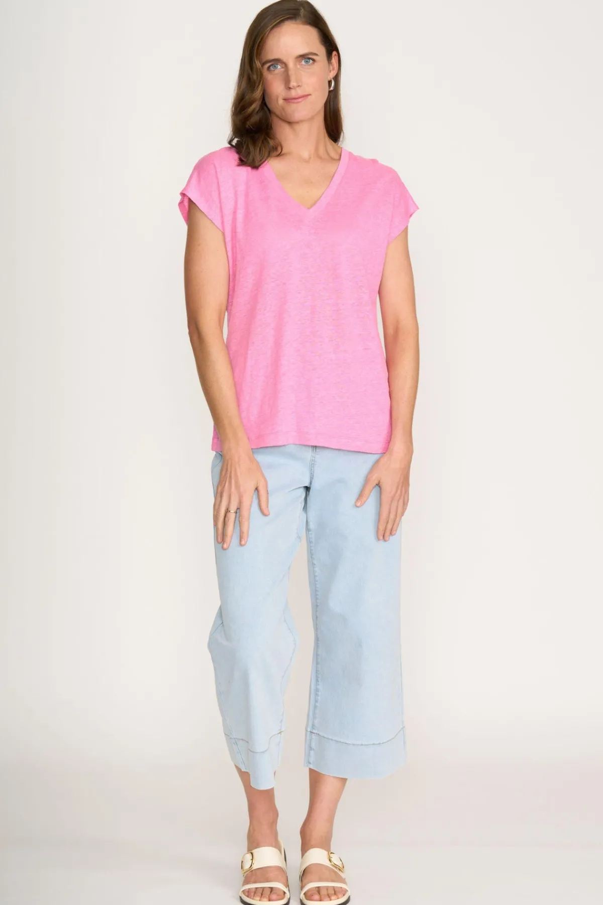 This playful button-up tee features a flattering cap sleeve and a chic v-neckline. Crafted from premium 100% linen jersey, it offers breathable comfort with a soft, natural feel. The eye-catching button detail down the back seam adds a fun twist, making it perfect for stylish days out or casual weekends.
