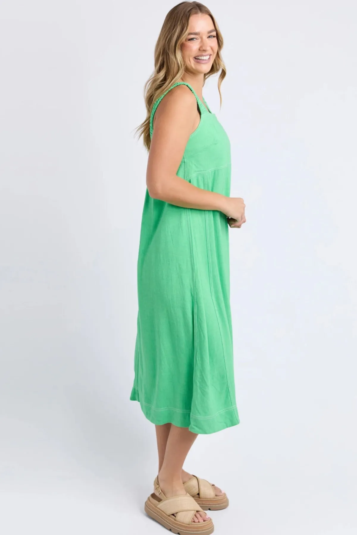 A cool and classic wardrobe staple perfect for both casual and polished looks. Crafted from a breathable linen-lyocell blend, this midi dress offers a flattering A-line silhouette that flows effortlessly. The wide elastic straps provide comfort and bra-friendly coverage, while the contrast stitching adds a touch of style. Its deep sapphire hue is timeless, making it easy to transition from day to night with minimal effort.