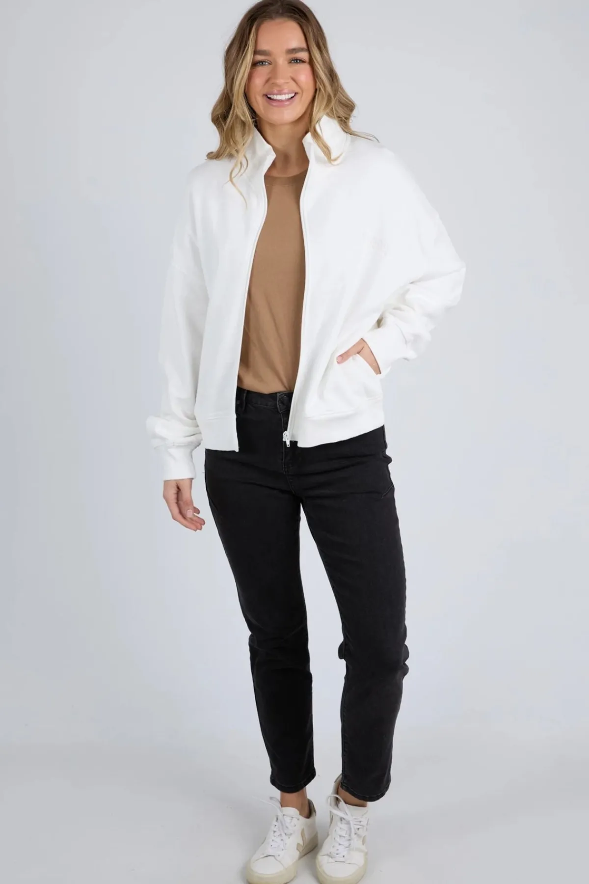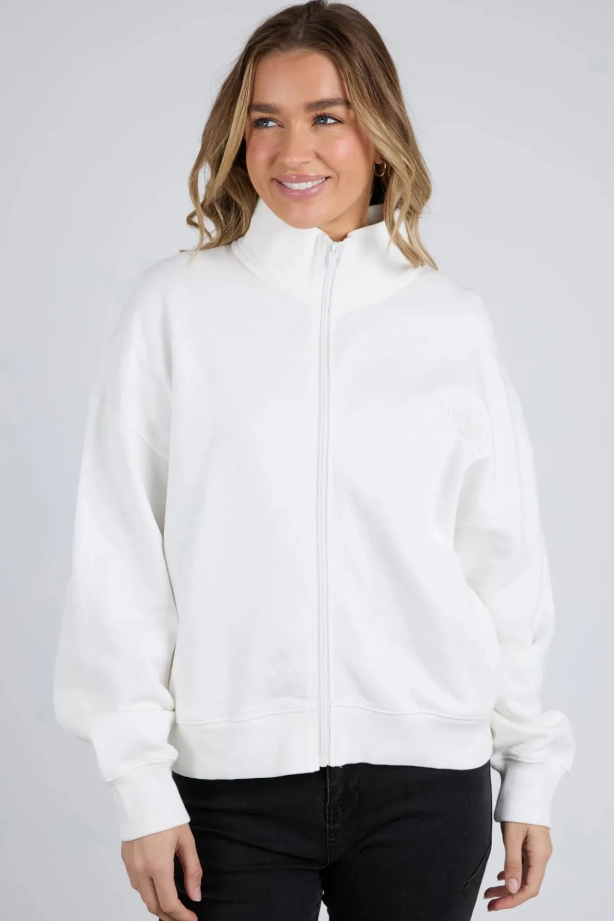 - High neckline with front zip