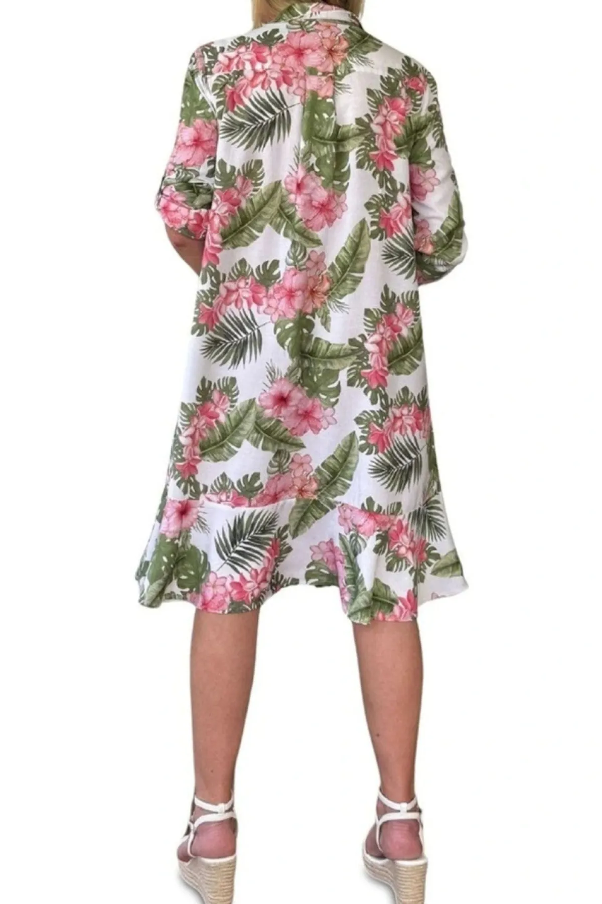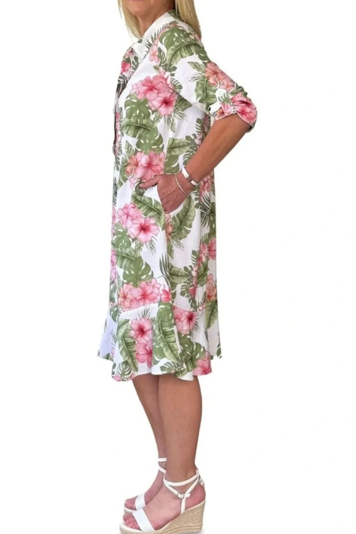 The Caledonia Dress is your go-to for easy, breezy style. Lightweight and comfy, it features a fun tropical print with green leaves and pink blooms on crisp white. With a relaxed fit, button-front, and playful button-tab sleeves, it moves with you for sunny days out or casual hangs. Stay cool and cute with this effortlessly charming dress!