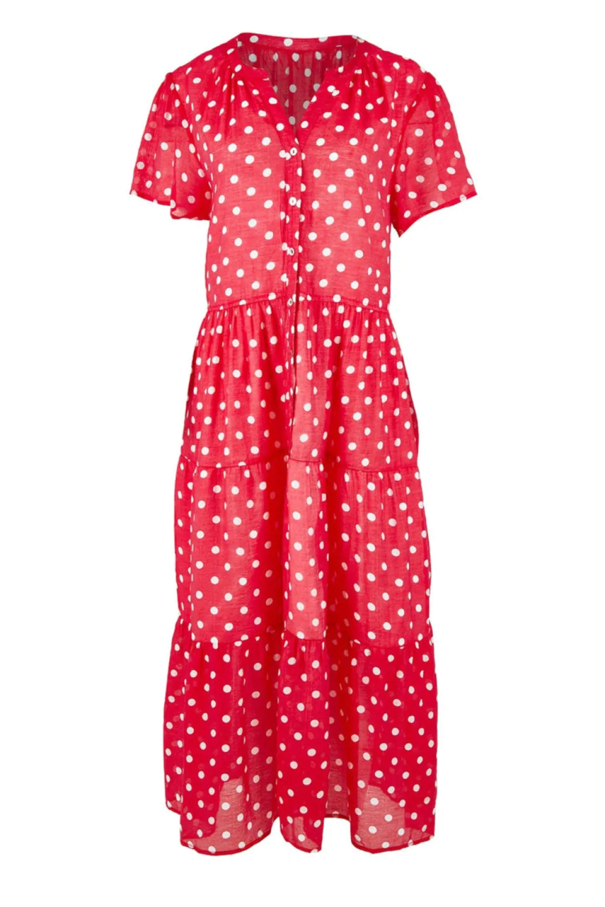 Designed with short sleeves and a partial button-through bodice, this playful spot dress combines relaxed charm with everyday ease. A lightweight cotton lining through the body provides breathable coverage, while the tiered calf-length skirt adds movement and style.