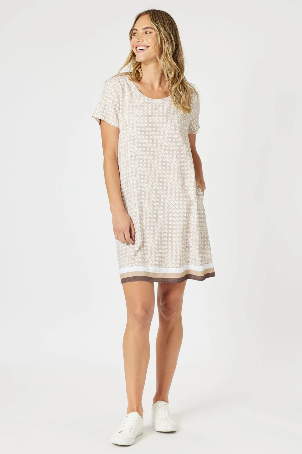 The Rattan Dress by Gordon Smith is a statement in effortless style. Crafted from a breathable viscose linen blend with a soft washer finish, it showcases a stunning all-over rattan-inspired print, finished with a contrasting solid stripe border along the hem for a chic touch. Cut in an easy shift silhouette, this dress is designed with a rounded neckline and short sleeves for everyday wearability, while side pockets add that must-have practicality. Light, versatile, and flattering, its the perfect piece to take you from brunch to beach walks and beyond. Fashion that fits the way you live.