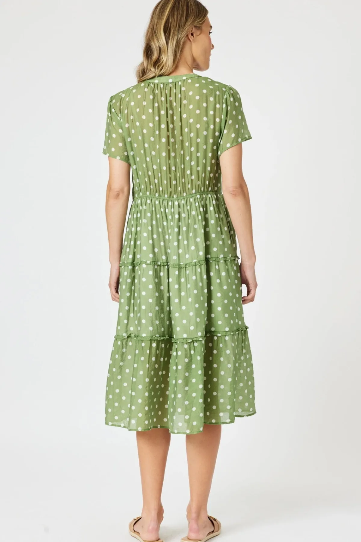 The Basil Spot Dress features a playful white spot print on a fresh basil green base in the signature Gordon Smith silhouette. Designed with short sleeves and a partial button-through bodice, it combines relaxed charm with everyday ease.