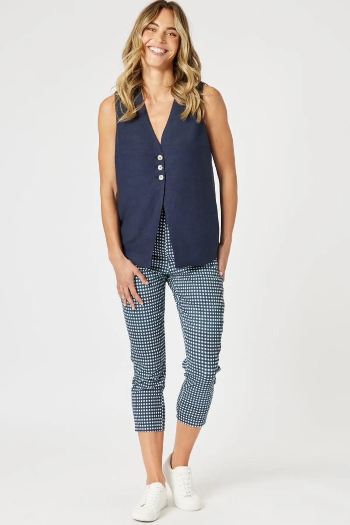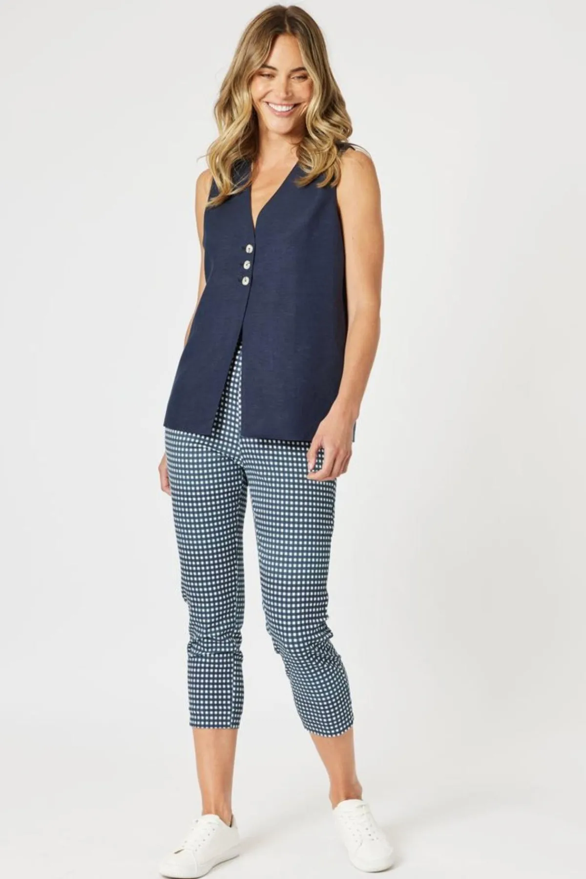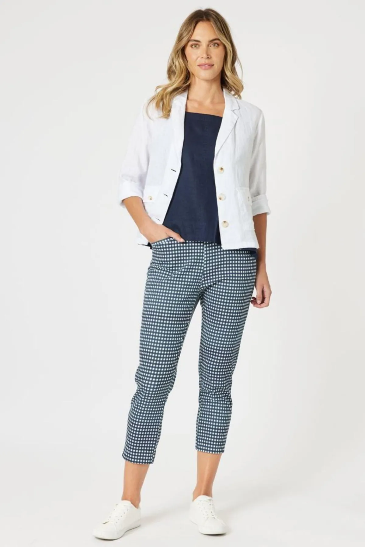 A customer favourite for good reason! Our bestselling pants by Gordon Smith return in a playful yet polished gingham print, combining your favourite fit with a new season twist. Made from super-stretch fabric for unbeatable comfort, this slim-leg pant features a flat front waistband for a sleek silhouette and functional pockets for everyday ease. It’s the perfect balance of style and comfort – no wonder it’s a customer favourite.
