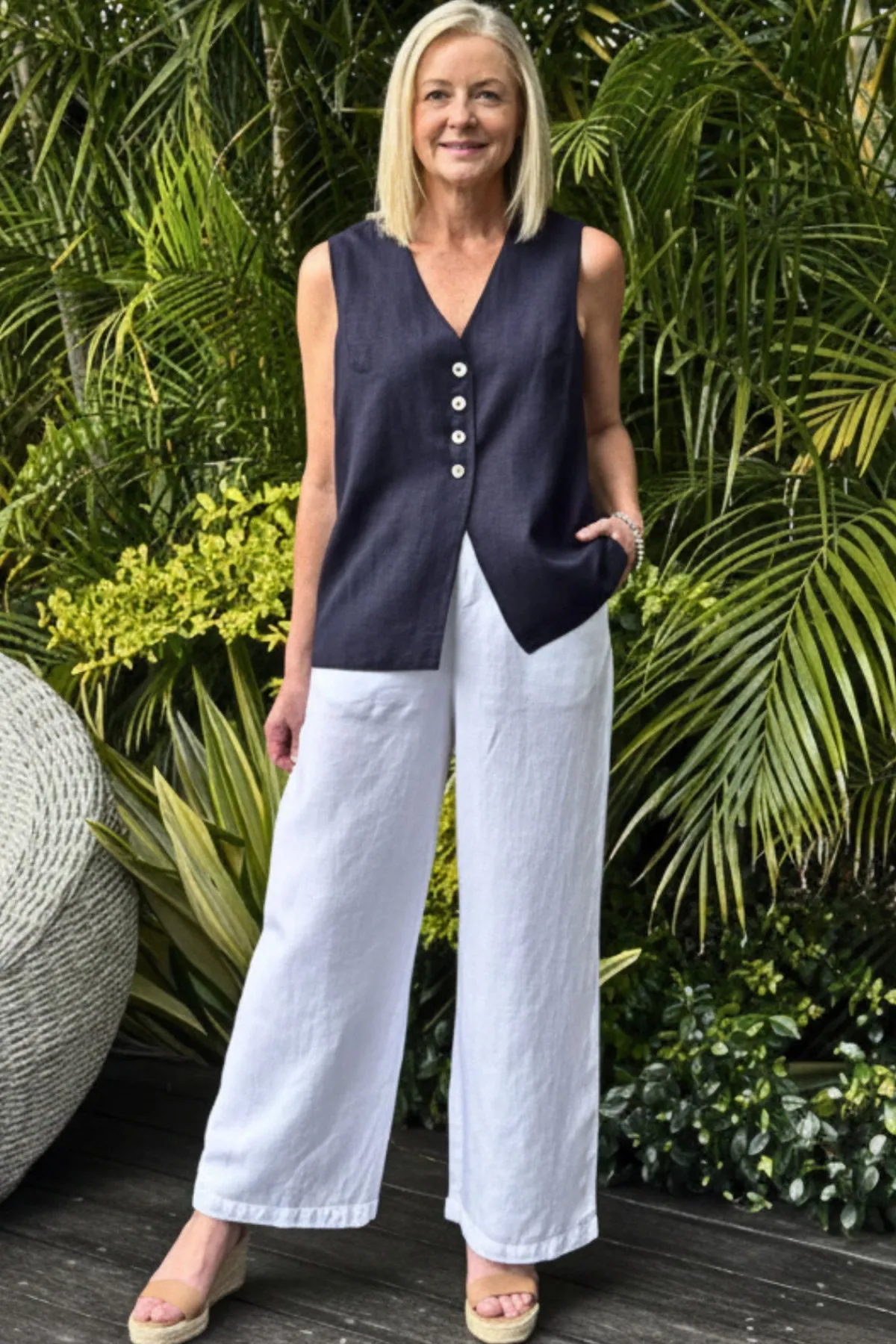 The Lino Pant is an ankle-length, wide-leg style crafted from a soft linen blend – perfect for warm days and effortless dressing.Designed with a flat front waistband and belt loops for a clean, tailored look, it also features an elasticated back for added comfort and ease of wear.