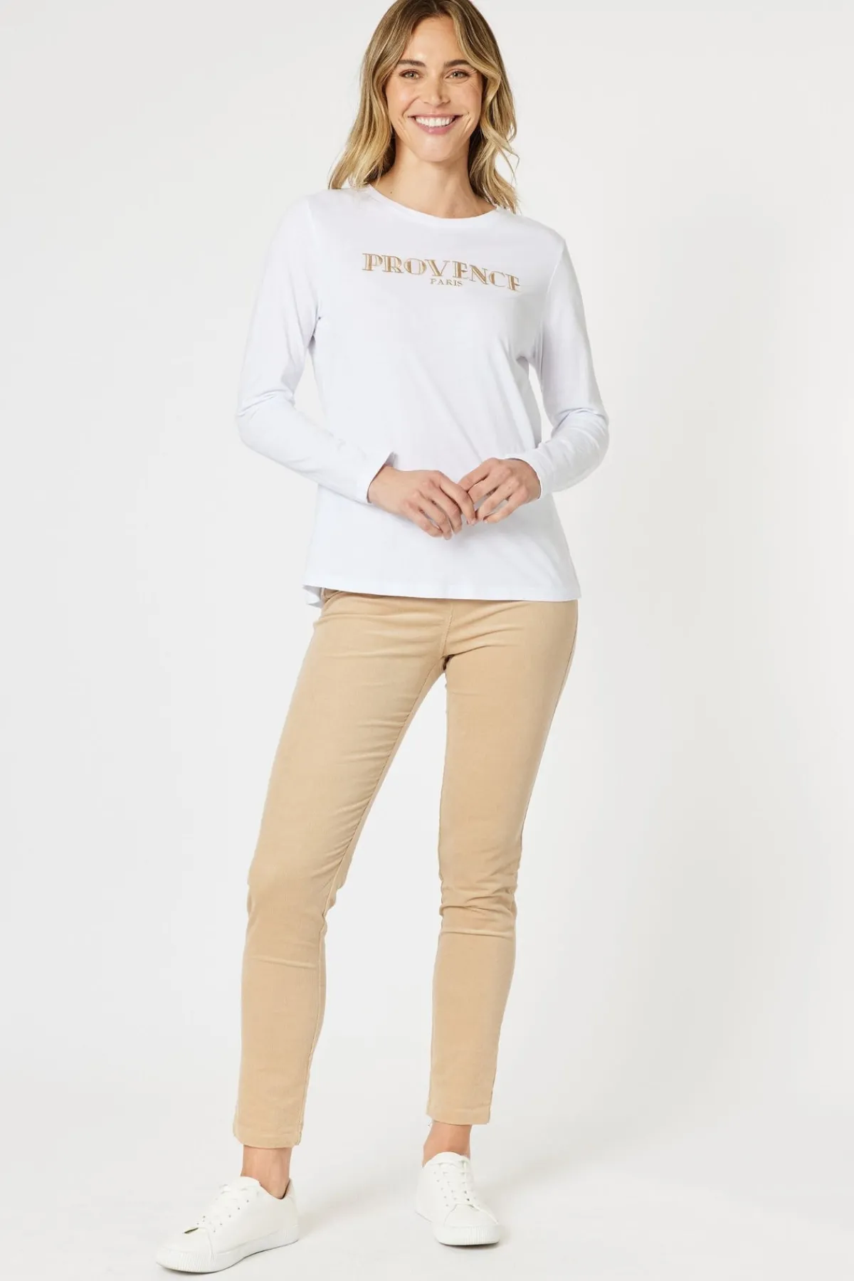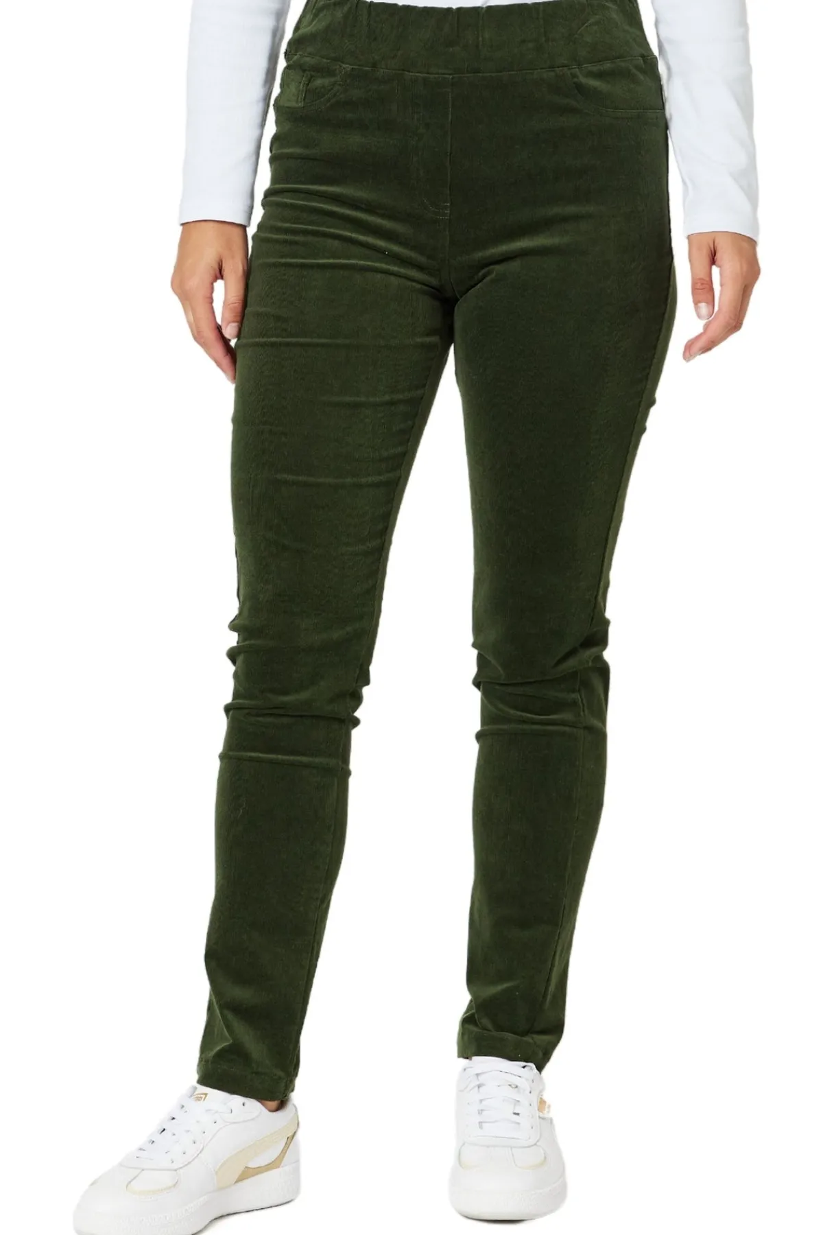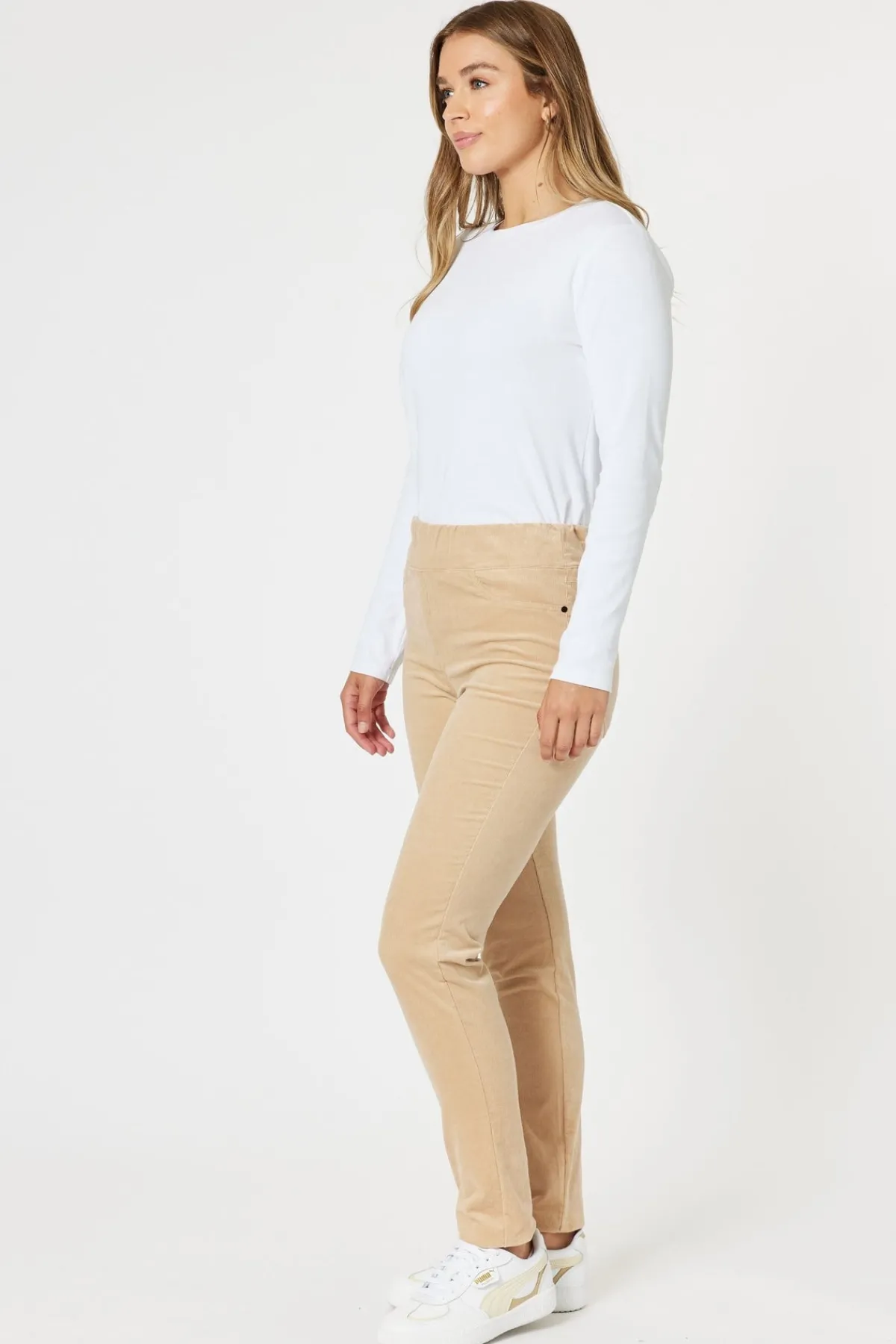 Maximize your style and comfort with the Harper Slim Leg Cord Pant. These high rise pants are designed with a slim leg and pull on design for a flattering fit. Featuring faux front pockets, these pants offer the look of traditional pockets without the added bulk.