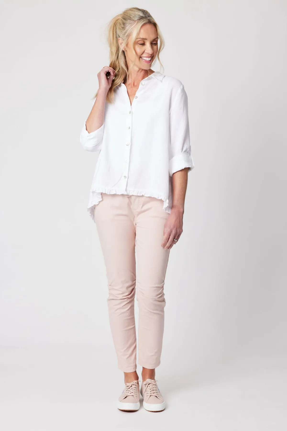 Update your linen shirt with the new Ruffle hem shirt. The perfect length to wear untucked, with a flattering high low hem it pairs back with the jersey waist pant, or style back with a slim leg jean for everyday style.