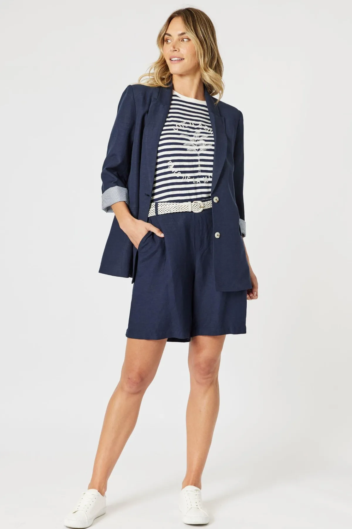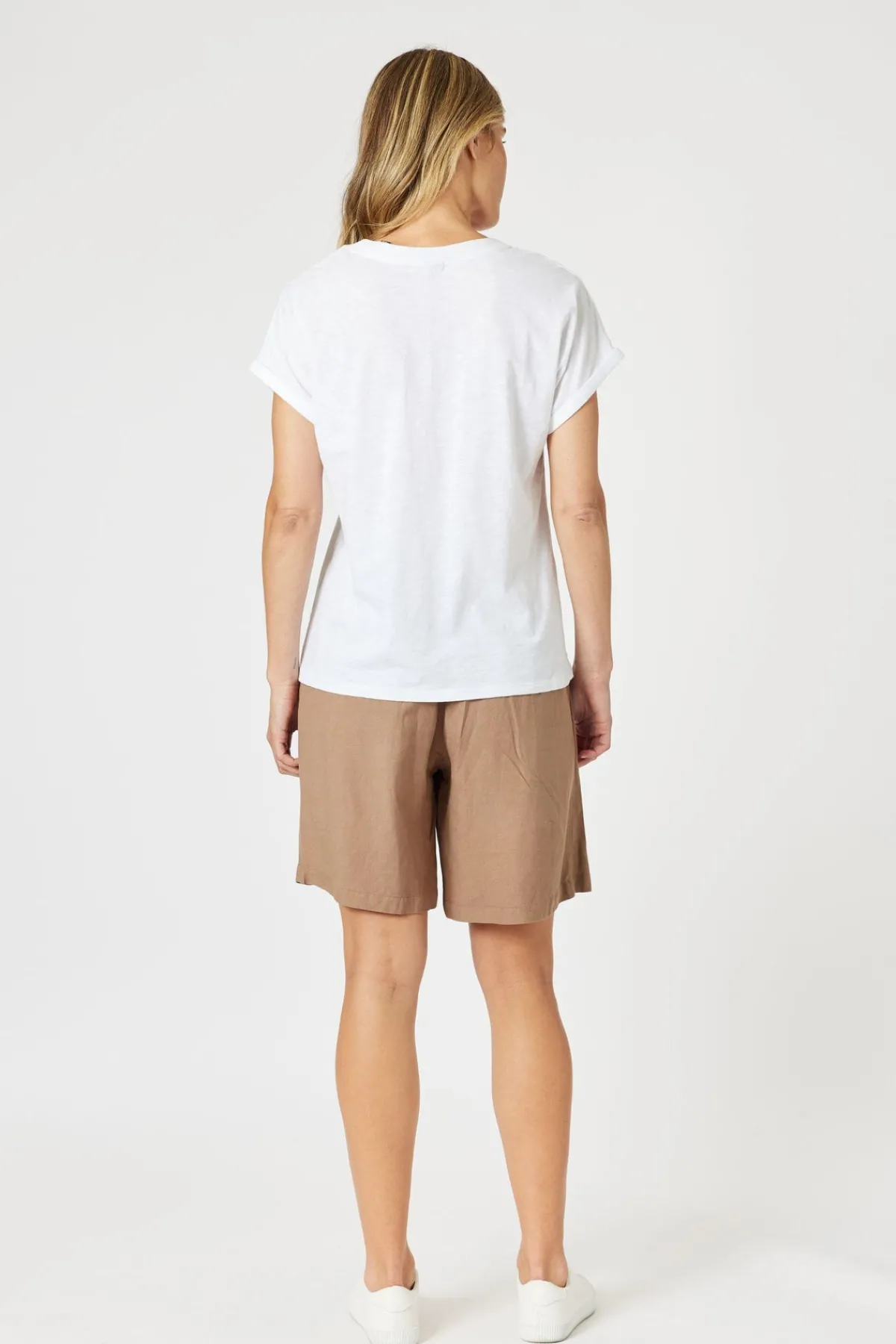 The Lino Short is a versatile and comfortable wardrobe staple made from a soft linen blend, perfect for warm-weather wear. Designed with a flattering high-rise fit, it features a flat front waistband for a polished look and an elasticated back for added comfort and easy pull-on functionality. The knee-length cut offers modest coverage while maintaining a relaxed and modern silhouette. Functional side pockets and belt loops add practicality and style, while the soft fabric makes them ideal for all-day comfort. Perfect for travel, these shorts combine ease, comfort, and effortless style.