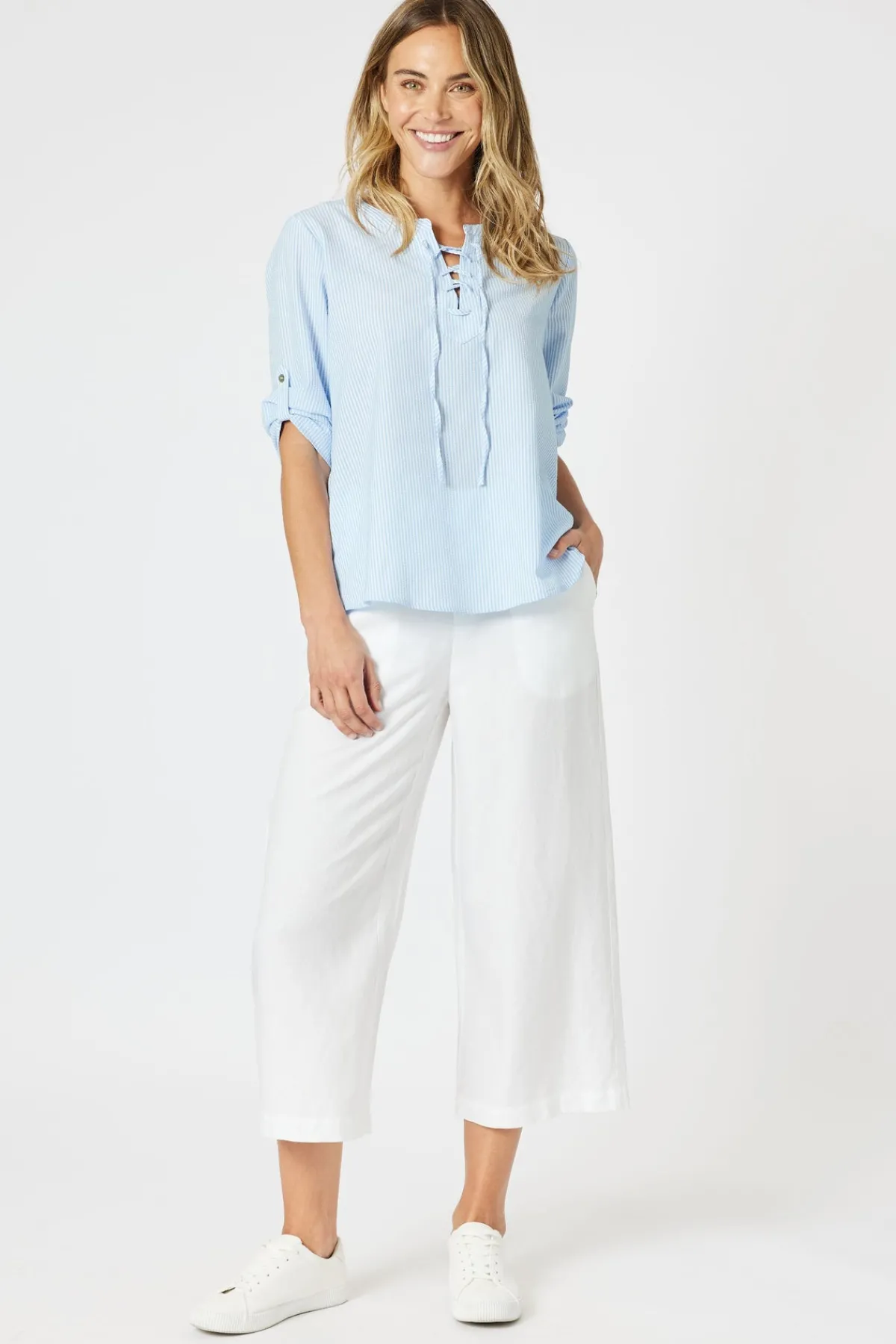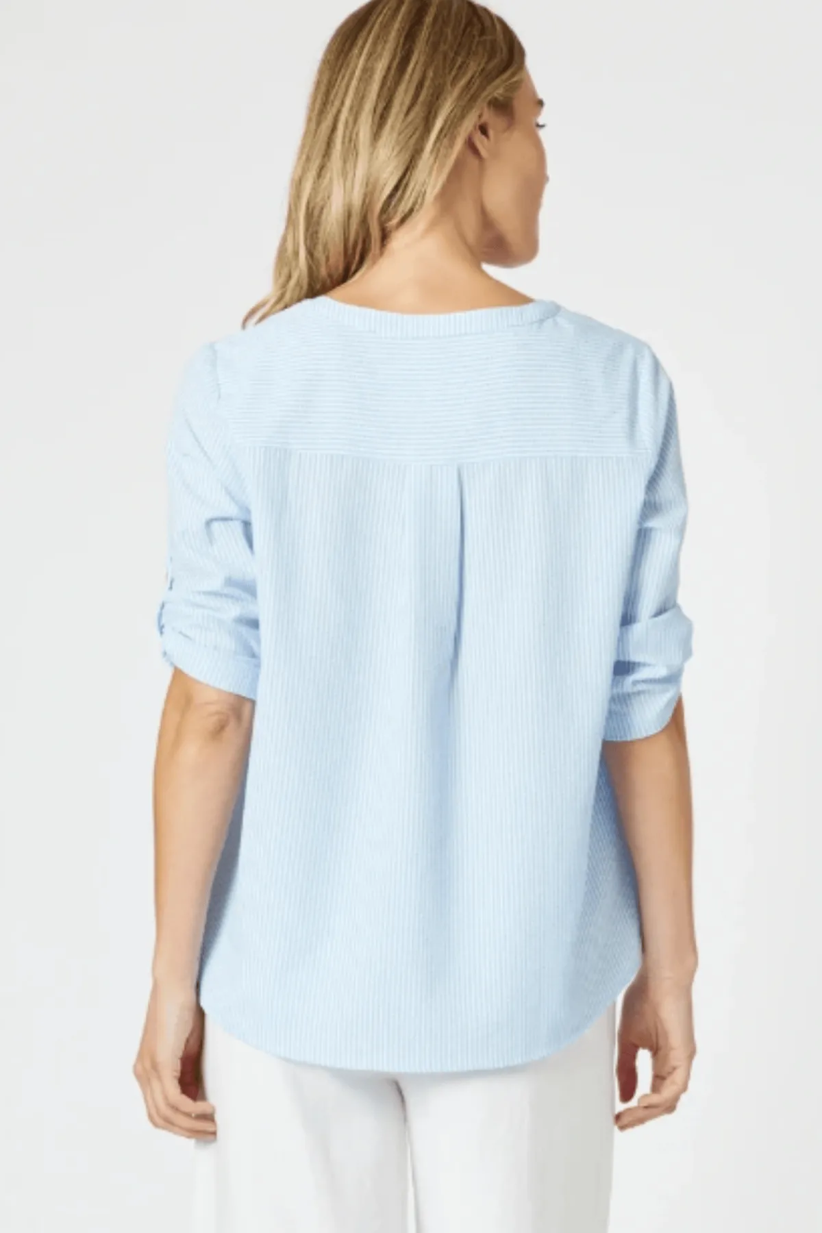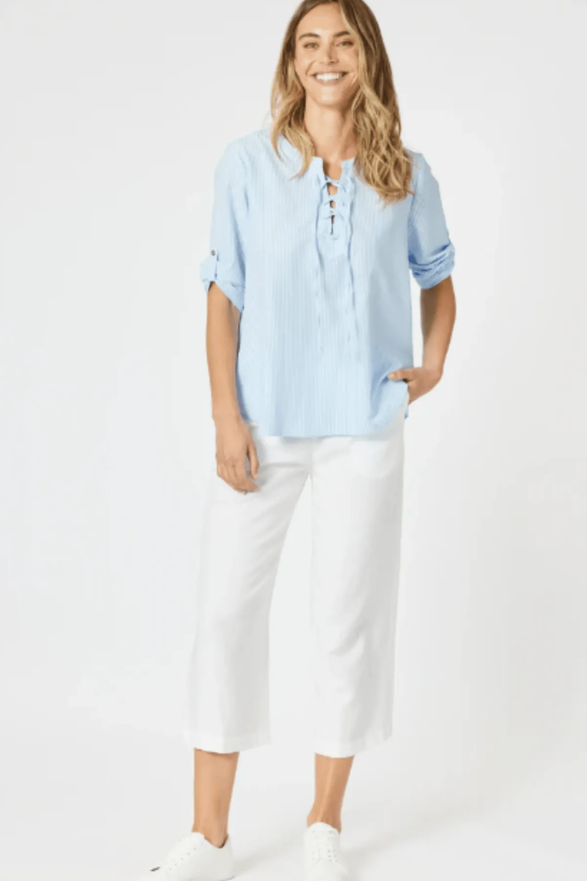 The Marine Stripe Top is a breezy, nautical-inspired piece designed for effortless everyday style.Crafted from a lightweight, crinkle-textured fabric, it features a soft blue and white stripe pattern and a lace-up neckline for a touch of casual charm.Roll-tab sleeves add versatility, allowing you to wear them long or cuffed.This top is perfect for warm days, travel, or laid-back outings – bringing a fresh, coastal vibe to any wardrobe.