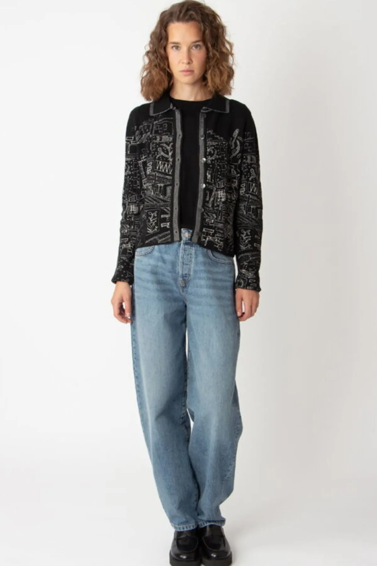 Jacquard jacket with a favela motif, knitted from a blend of wool and viscose. Standard fit with long sleeves, collar, and front button fastening.
