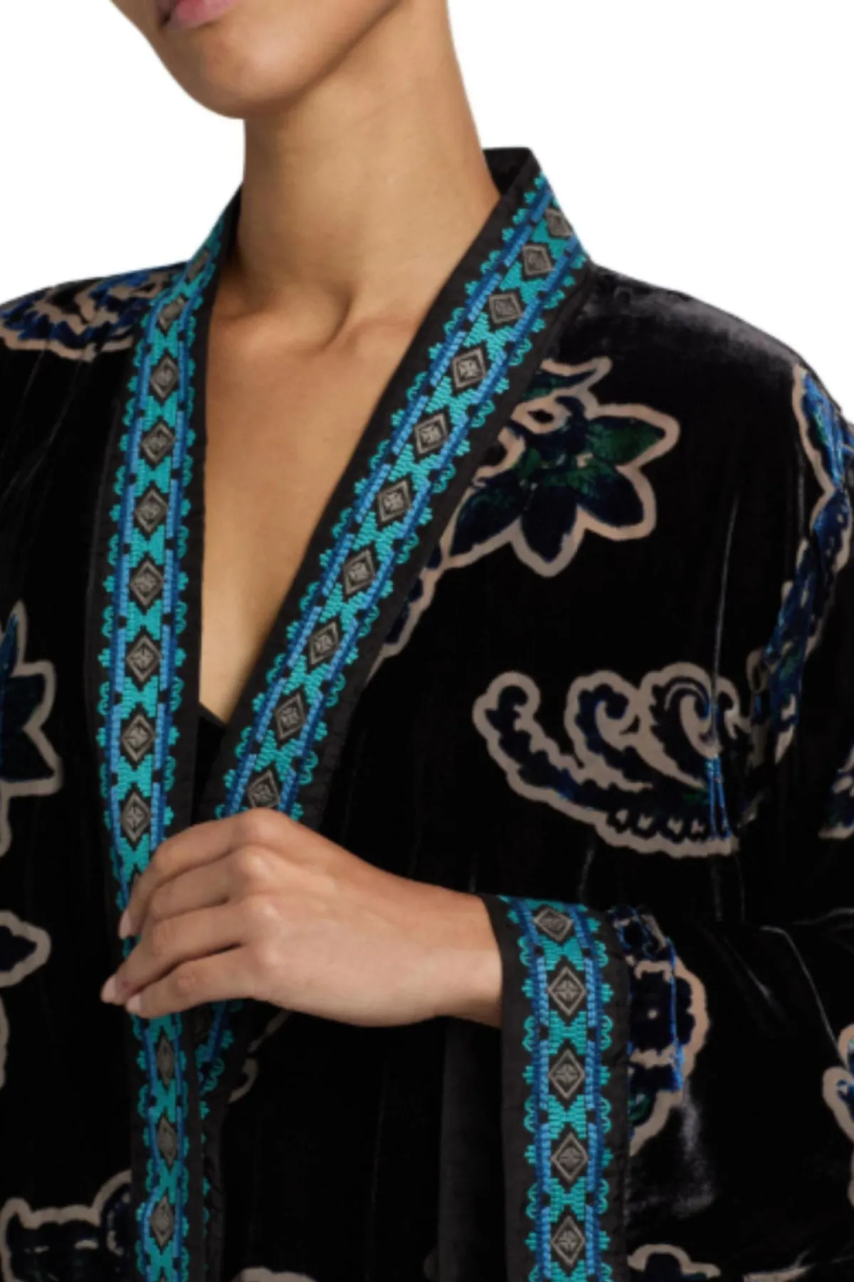 Rich, expressive, and effortlessly dramatic, the Merhawi Kimono in Monade Burnout brings signature Johnny Was opulence to any outfit. Crafted from plush burnout velvet with intricate contrast trim, this relaxed kimono-style jacket flows beautifully and layers seamlessly over both denim and evening looks.