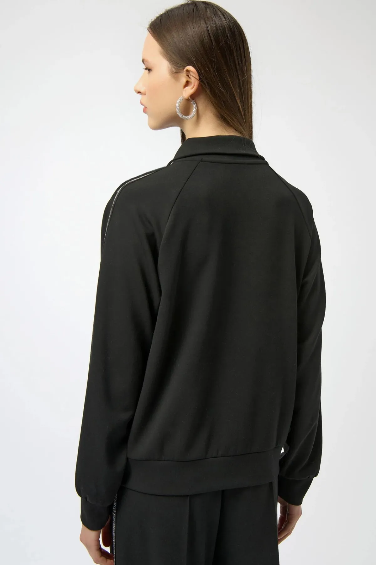 Crafted from ultra-soft scuba knit, this zip-front jacket features a cozy funnel collar with a drawstring and a chic cocoon silhouette for effortless comfort. A subtle metallic trim adds a touch of glamour, elevating its relaxed appeal.