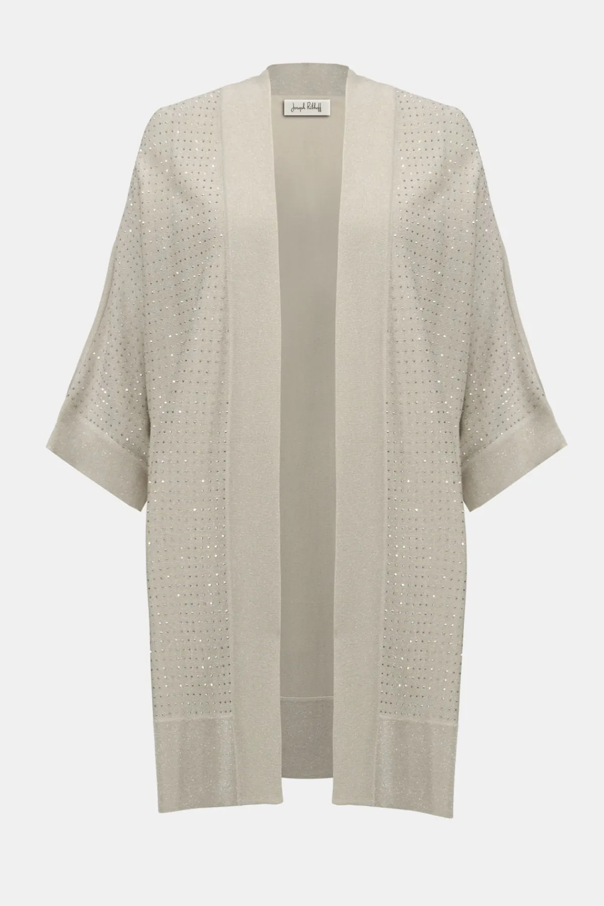 Crafted from soft sweater knit, this elegant cover-up receives a glamorous touch with shimmering iron-on detailing at the front. Its longline, open-front design and straight silhouette create a graceful, flowing look perfect for any occasion.