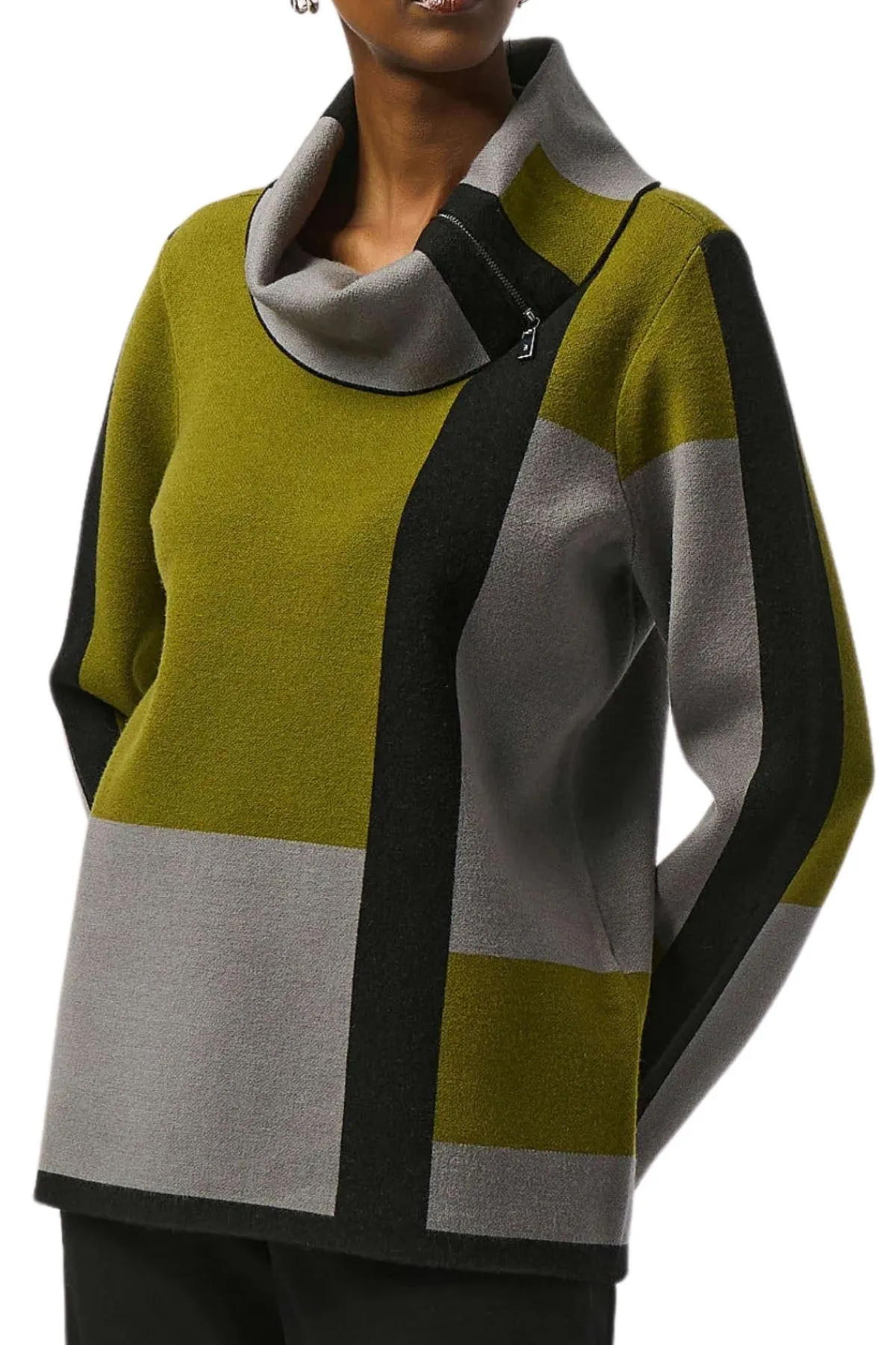 With its sophisticated cowl neck and chic colour-block design, this jacquard sweater is a smart addition to your cold-weather wardrobe. Long straight sleeves and a straight silhouette provide added comfort, making it both stylish and practical for cooler days.