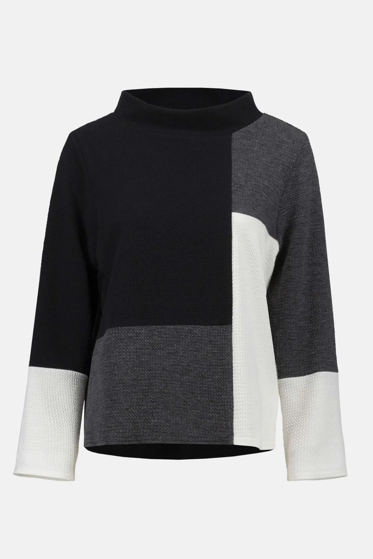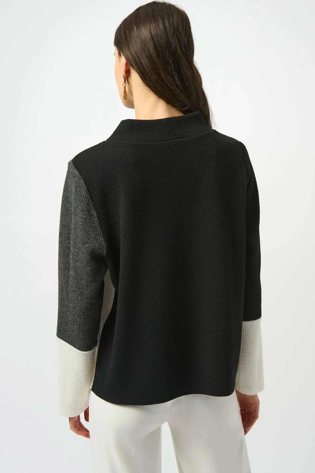 This textured jacquard knit top complements any contemporary attire. The elegant colour-block print adds a striking visual appeal. The boxy silhouette and funnel collar pair perfectly to create a structured yet relaxed design.