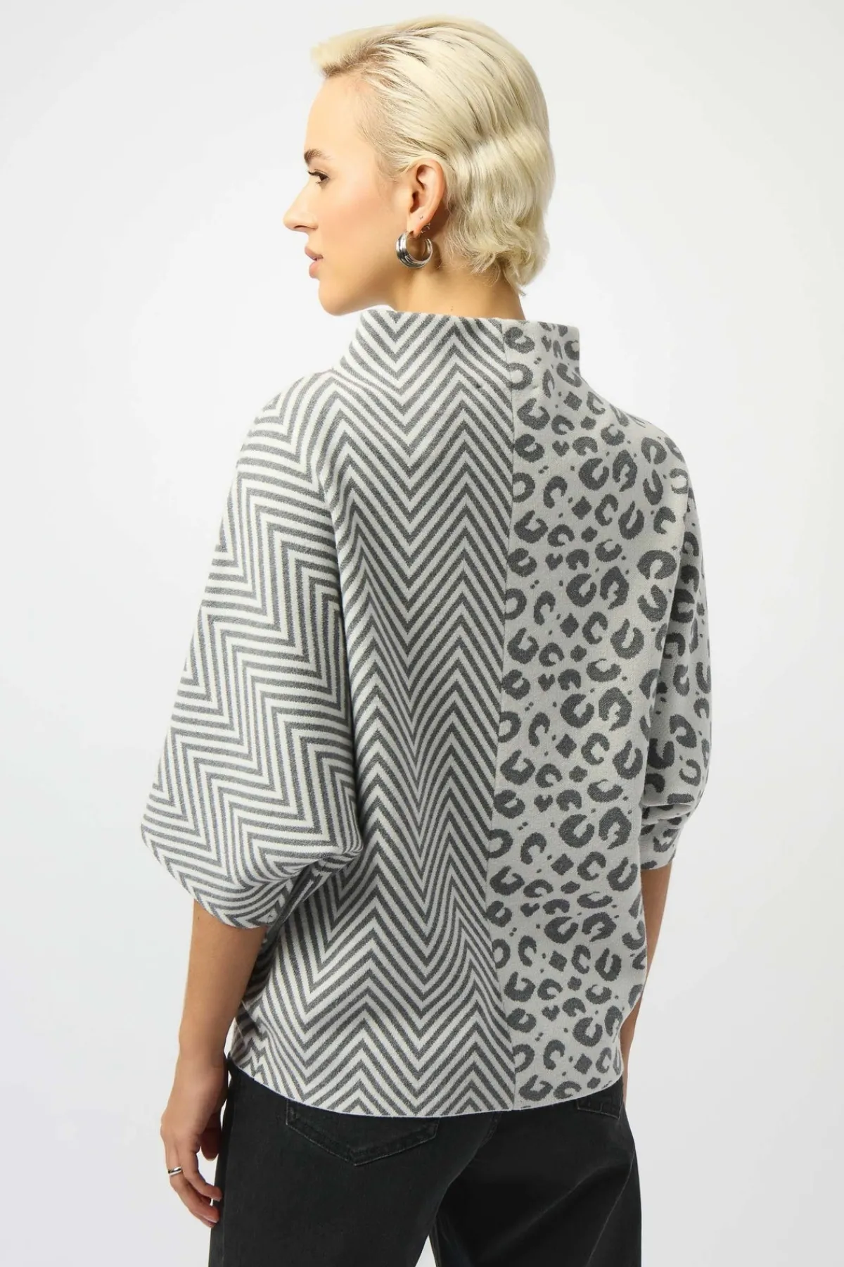 This distinctive top combines bold style with cozy comfort, showcasing a playful mix of patterns—half animal print and half herringbone. Crafted from luxurious jacquard sweater knit, it features a funnel neck, a relaxed boxy silhouette, and roomy three-quarter dolman sleeves for an effortlessly chic look.