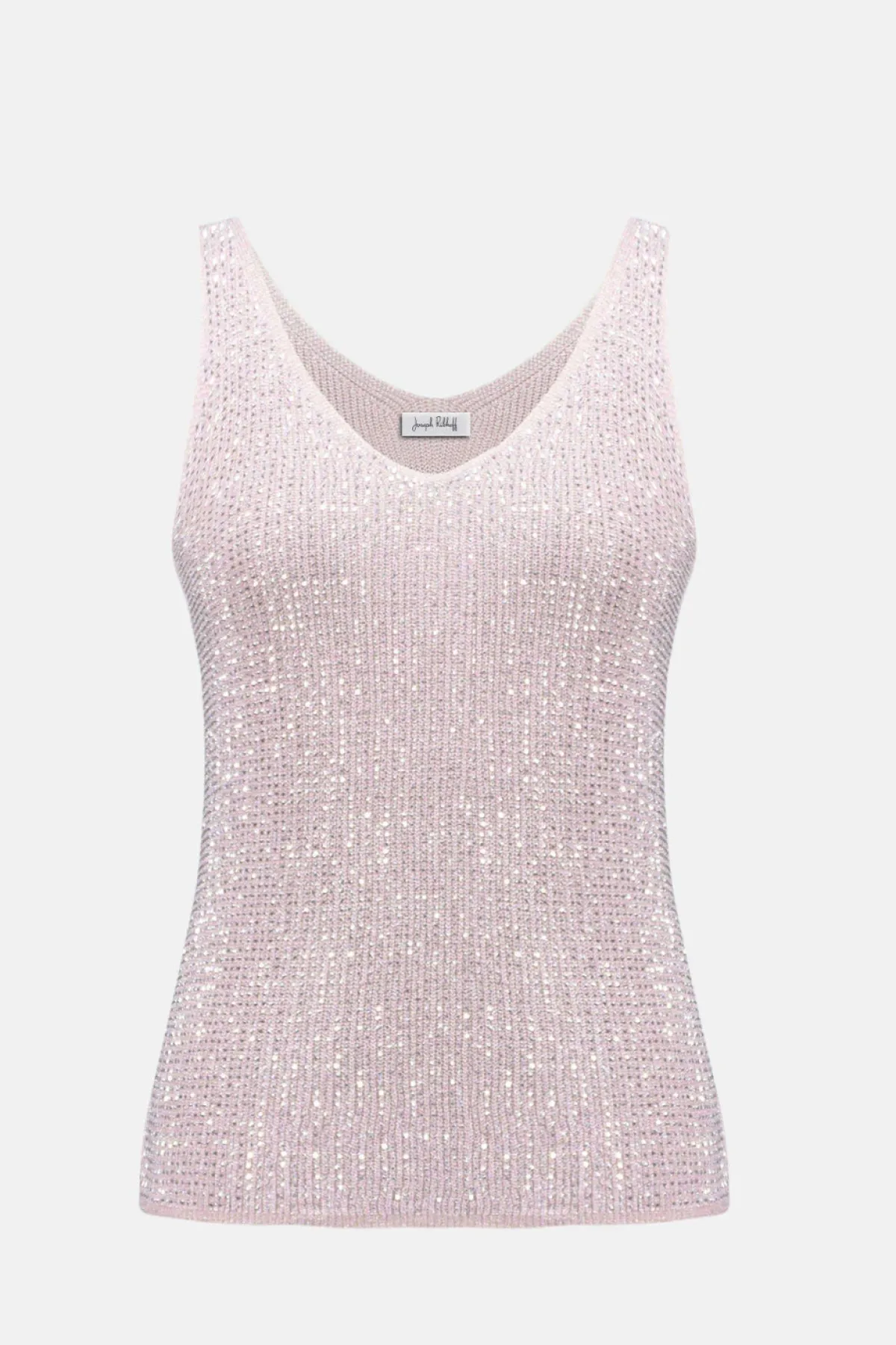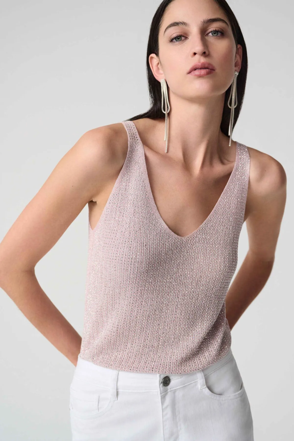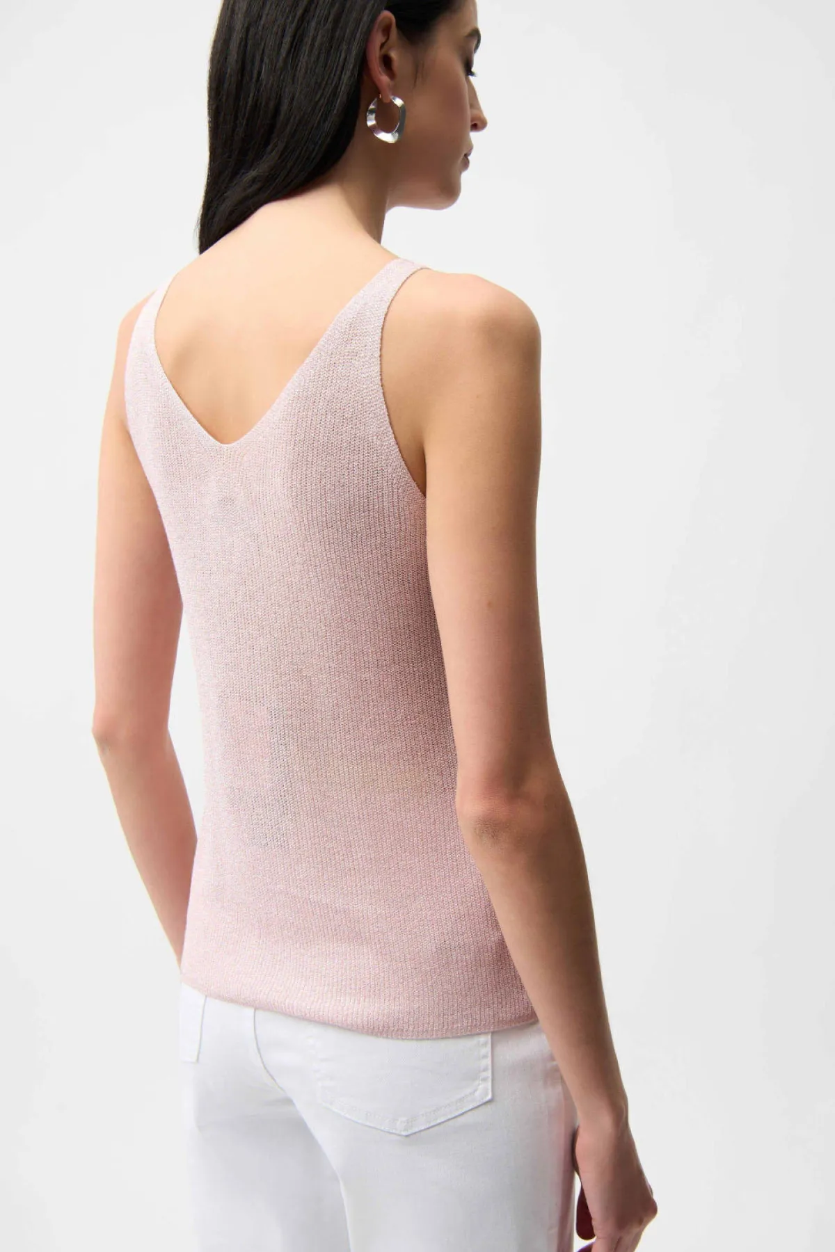 Get ready to dazzle at your next event in this sleeveless camisole. Crafted from a ribbed sweater knit blended with shimmering metallic fibres, it’s designed to catch the light and all the attention. The flattering V-neckline line in both the front and back, paired with iron-on detailing, makes this top perfect for any party or night out.
