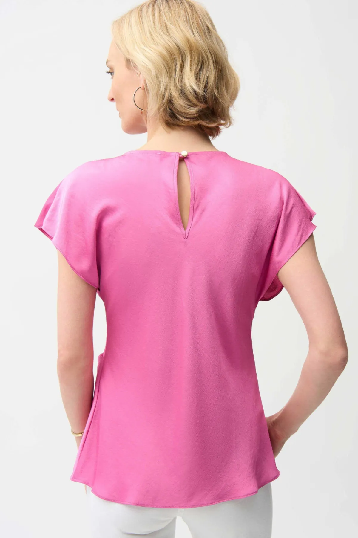Subtle shine meets sculpted shape in this recycled satin top, designed with a soft twist at the waist, dolman sleeves, and a scoop neckline that opens to a delicate back keyhole with button.