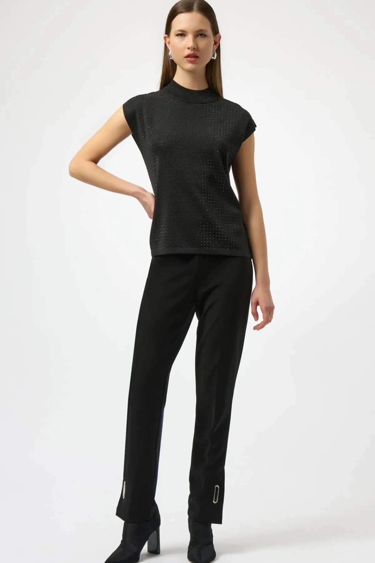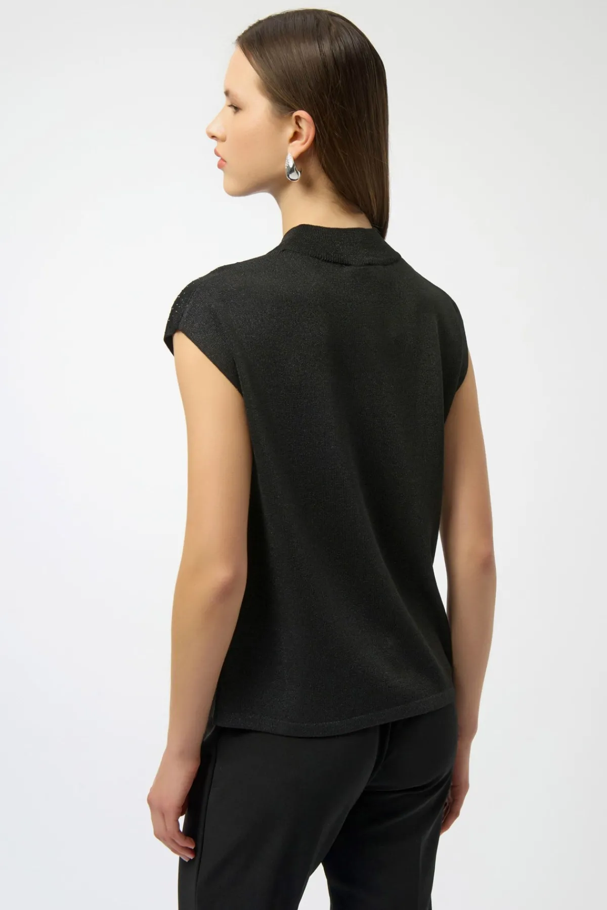 This versatile sleeveless pullover is a chic addition to your occasion wardrobe, featuring a sophisticated mock neck and elegant iron-on detailing. Crafted from a soft sweater knit in a flattering straight fit, it pairs beautifully with a variety of bottoms for a polished look.