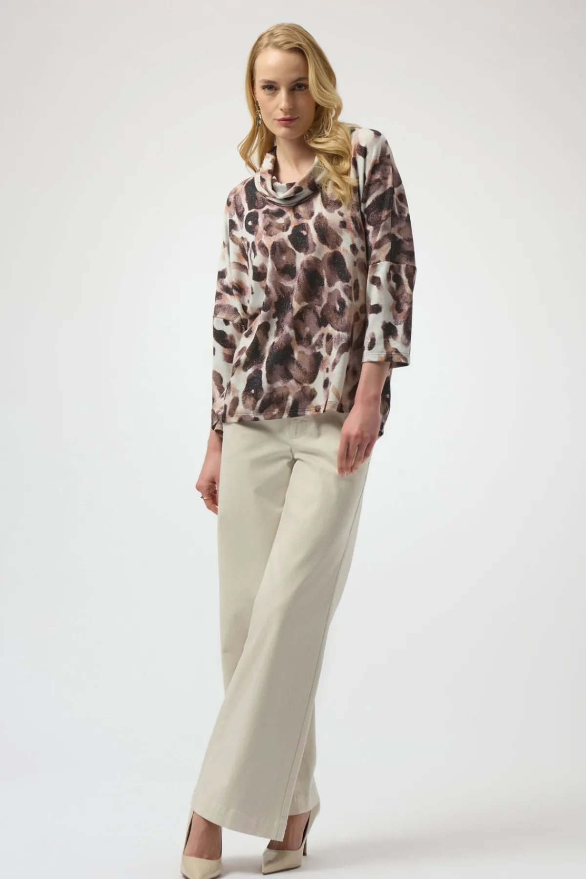 This sweater knit tunic showcases a relaxed boxy silhouette boasting an alluring animal print. The draped cowl neck and three-quarter dolman sleeves lend the piece its refined feel while the button detail at the centre back adds a touch more of flair.