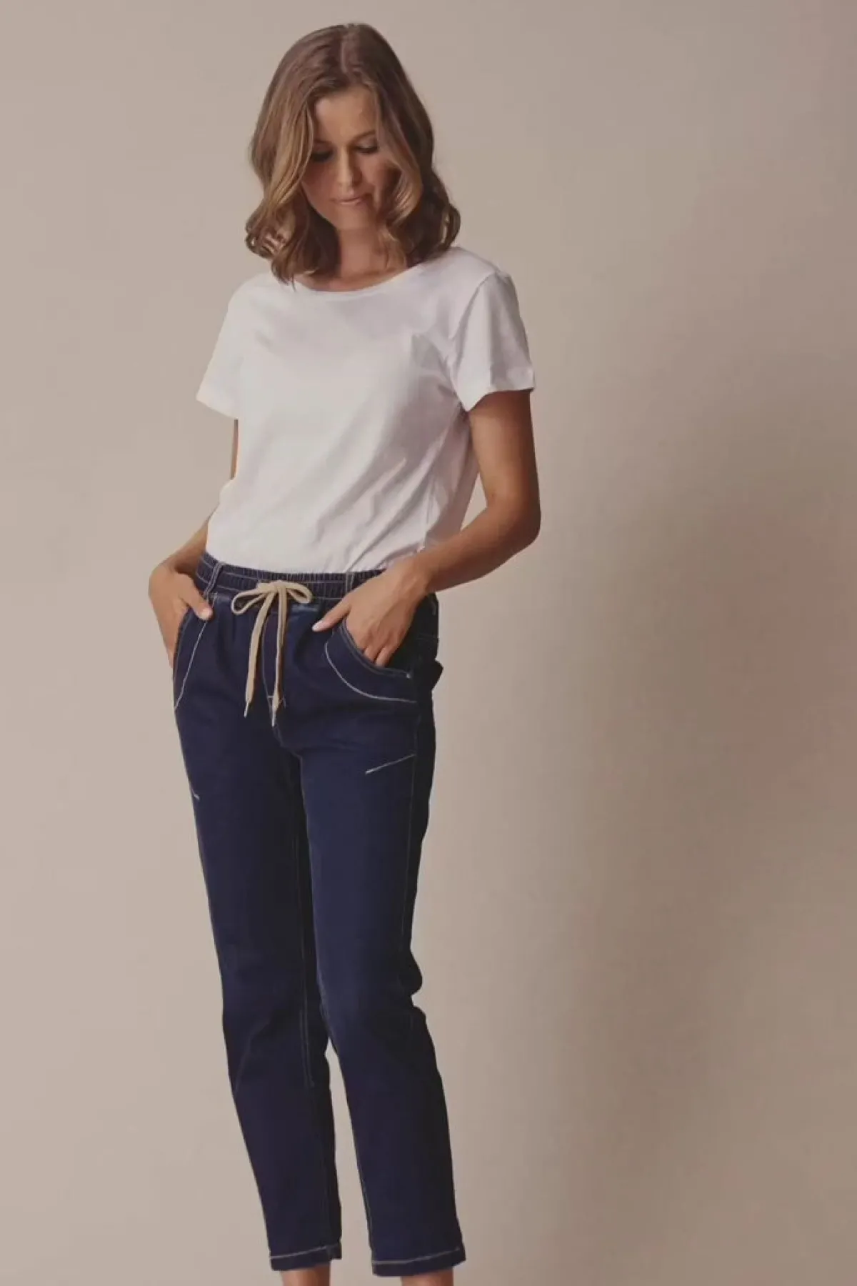 Casual jean with elasticated waist and adjustable drawstring tie. Soft handle distressed and new indigo colour achieved by special garment wash.