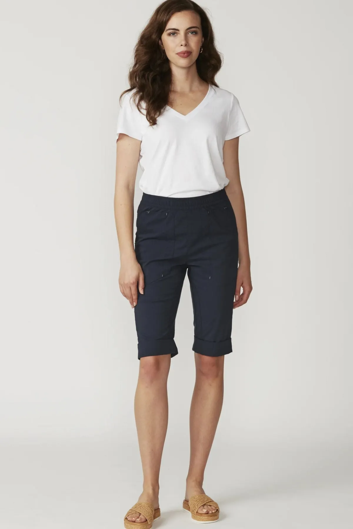 Relaxed knee length short with optional turn up cuff, features elasticated waist in lightweight cotton rich stretch fabric.