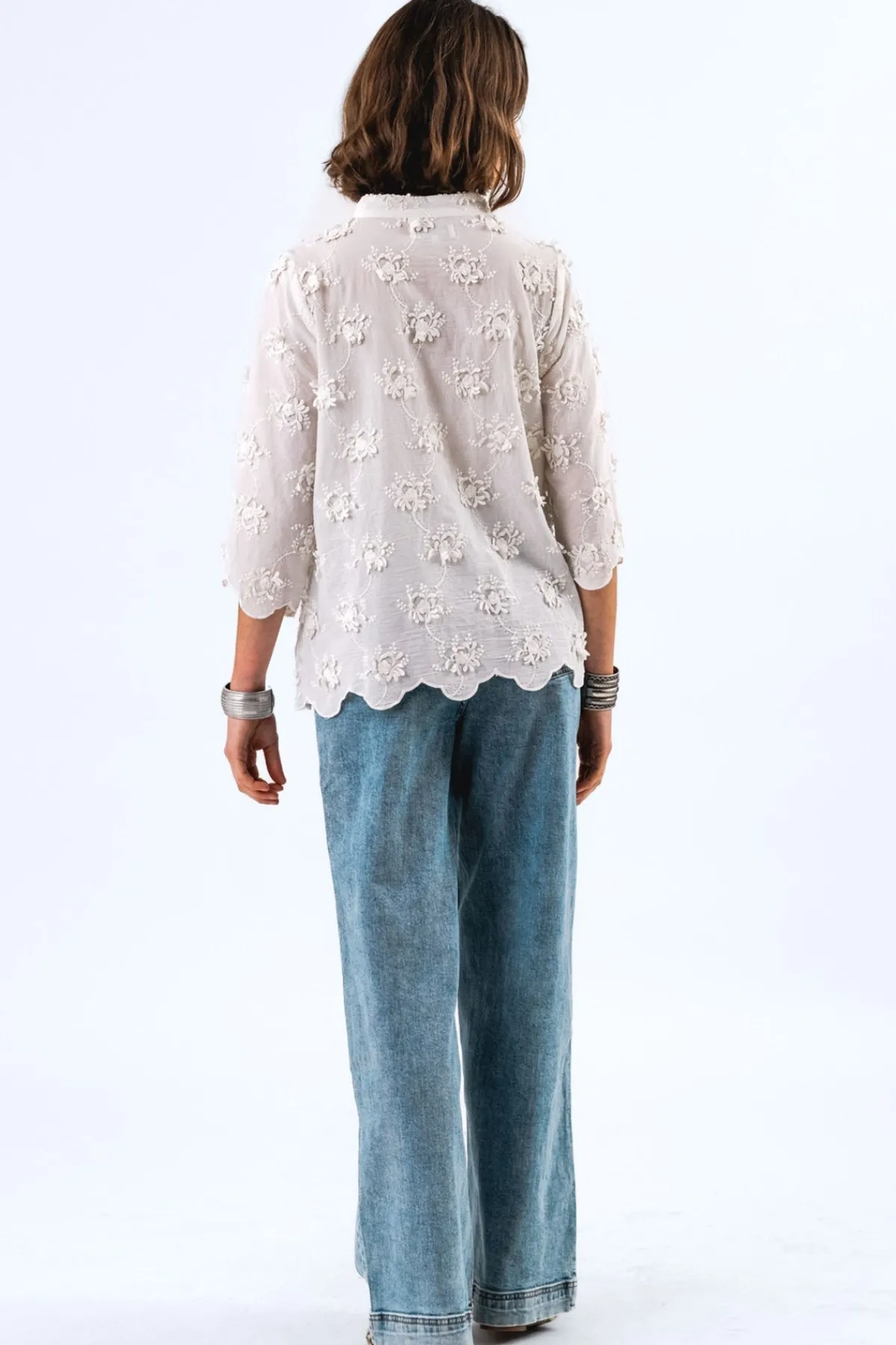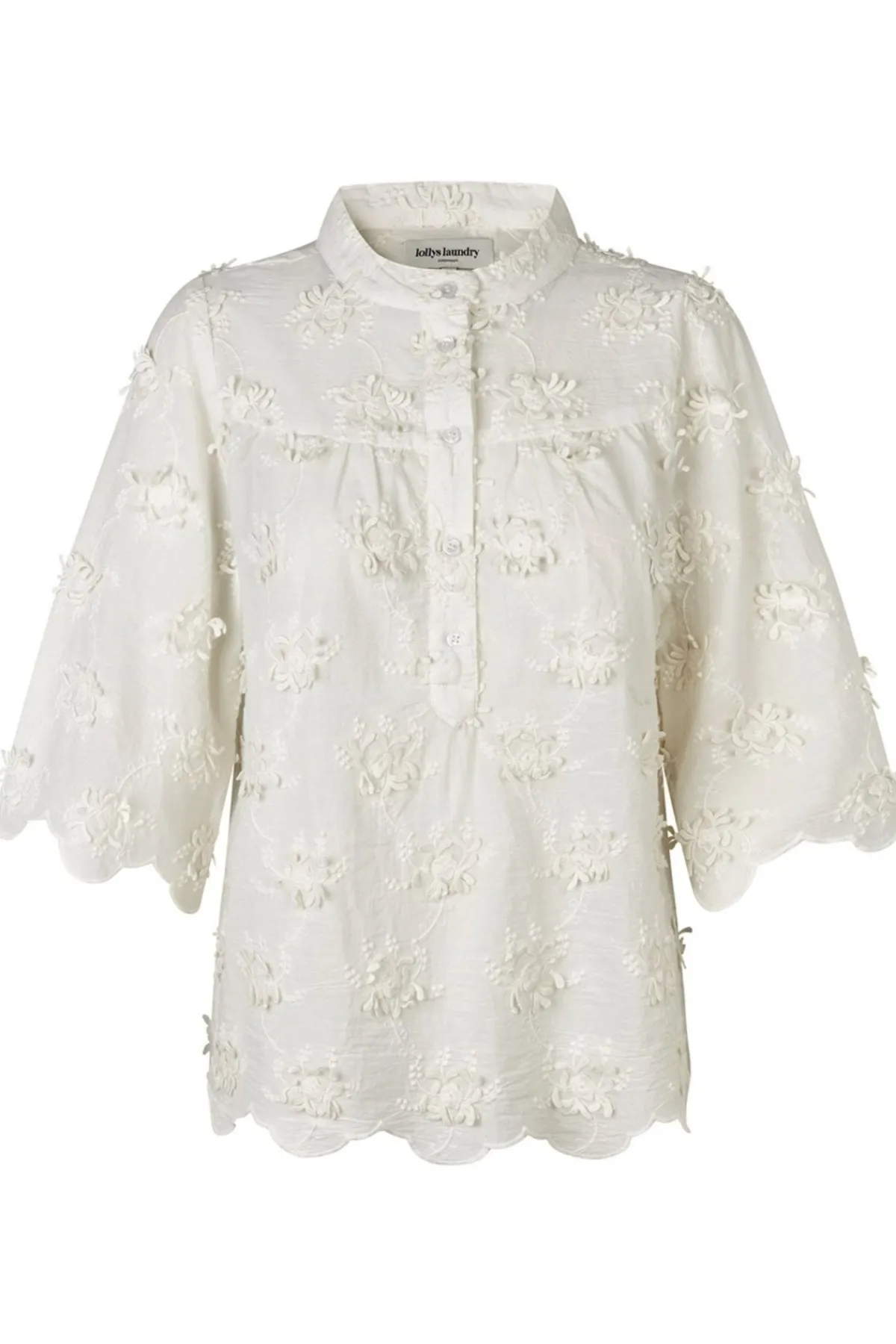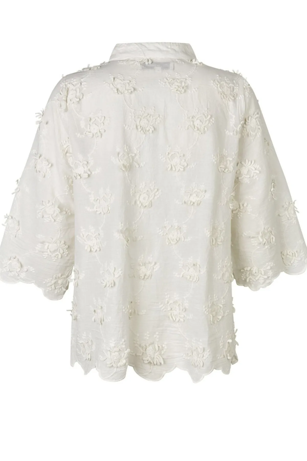 - Floral embroidery and scalloped edges at sleeves and hem