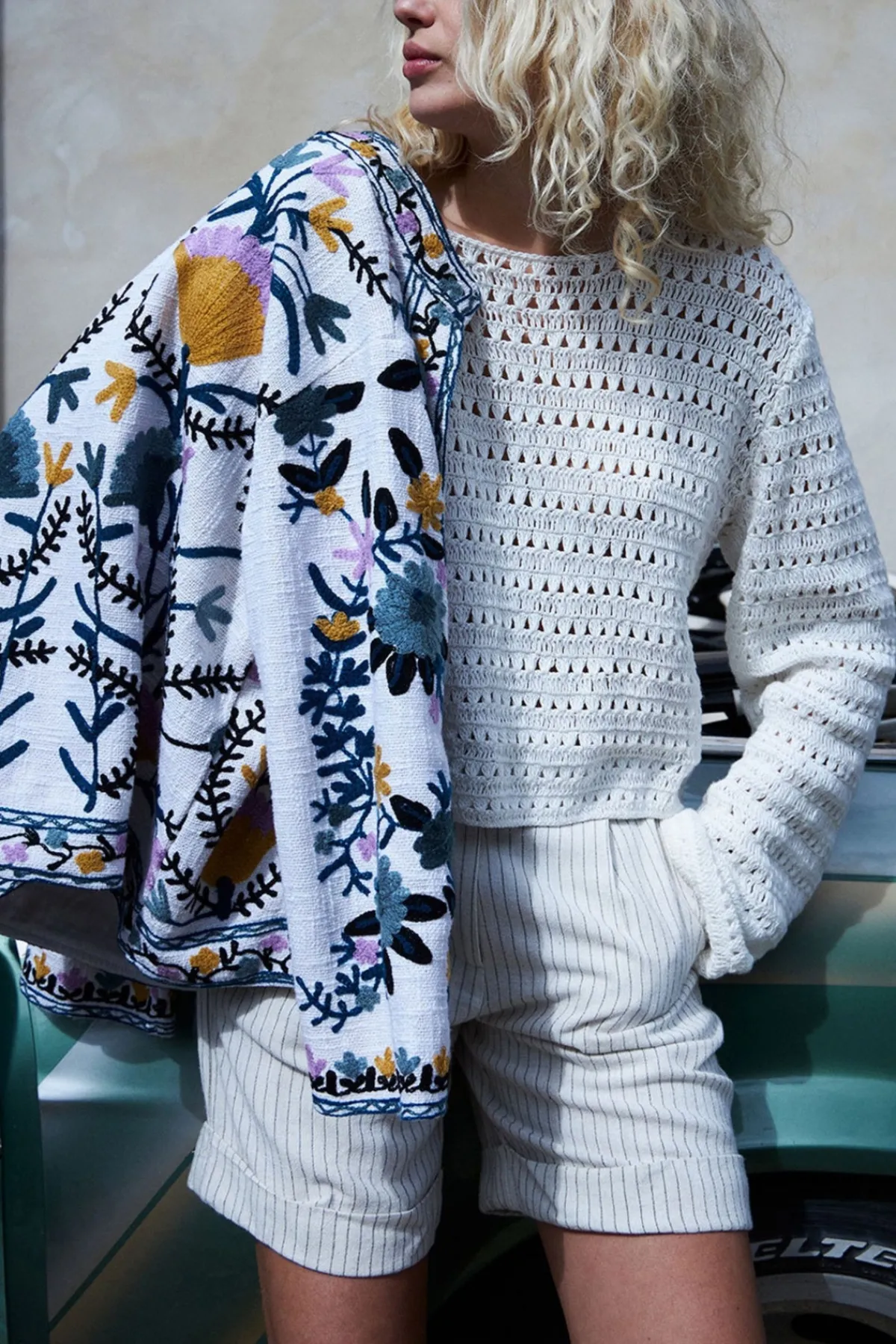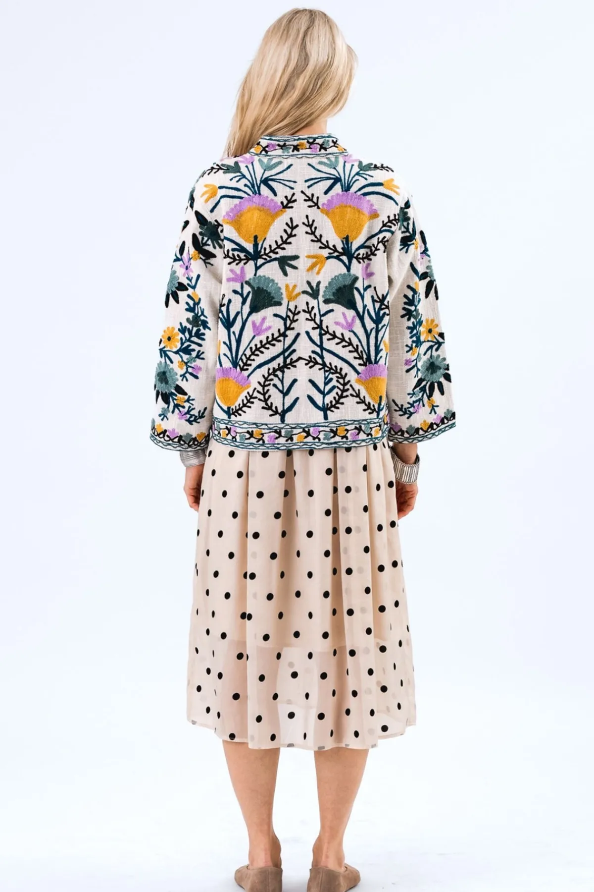 The SadieLL jacket is the perfect blend of bohemian charm and elegance. Featuring stunning floral embroidery, it adds a unique touch to any wardrobe. Made from 100% cotton for both comfort and style – ideal for the season’s many occasions.