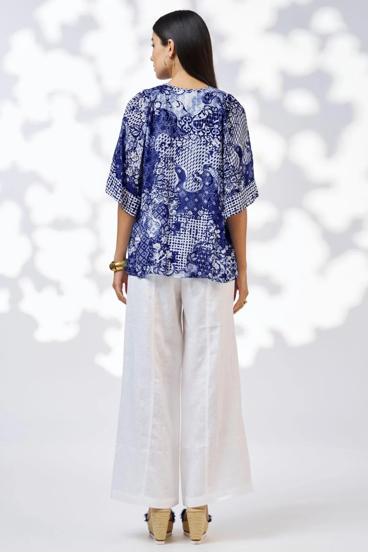 Floaty, printed blouse with a flattering V-neckline and shirred raglan sleeve shoulder detailing. Featuring a contrast sleeve hem panel to add interest. Lined through body.