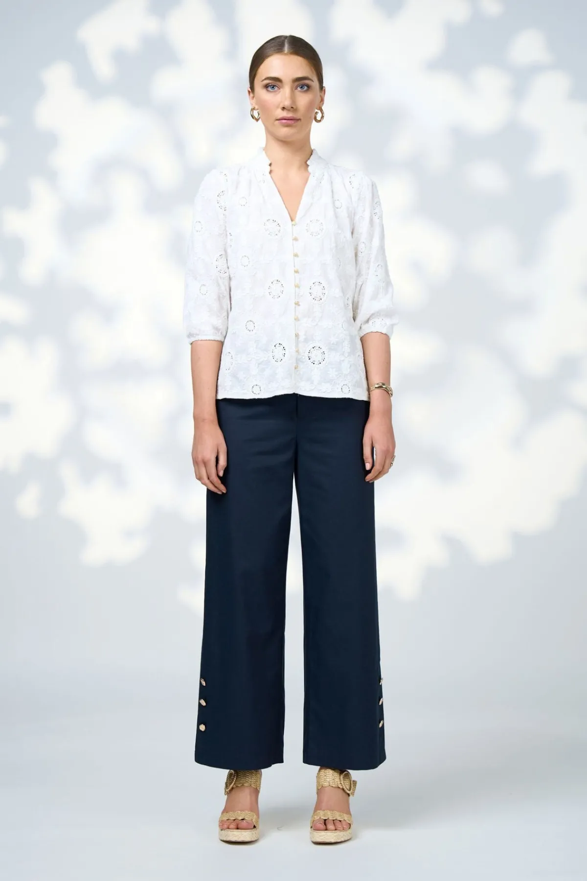 The Mischa Blouse features delicate broderie anglaise detailing, offering a feminine and sophisticated look perfect for any summer event. Its lightweight fabric ensures comfort while adding an elegant touch to your warm-weather wardrobe.